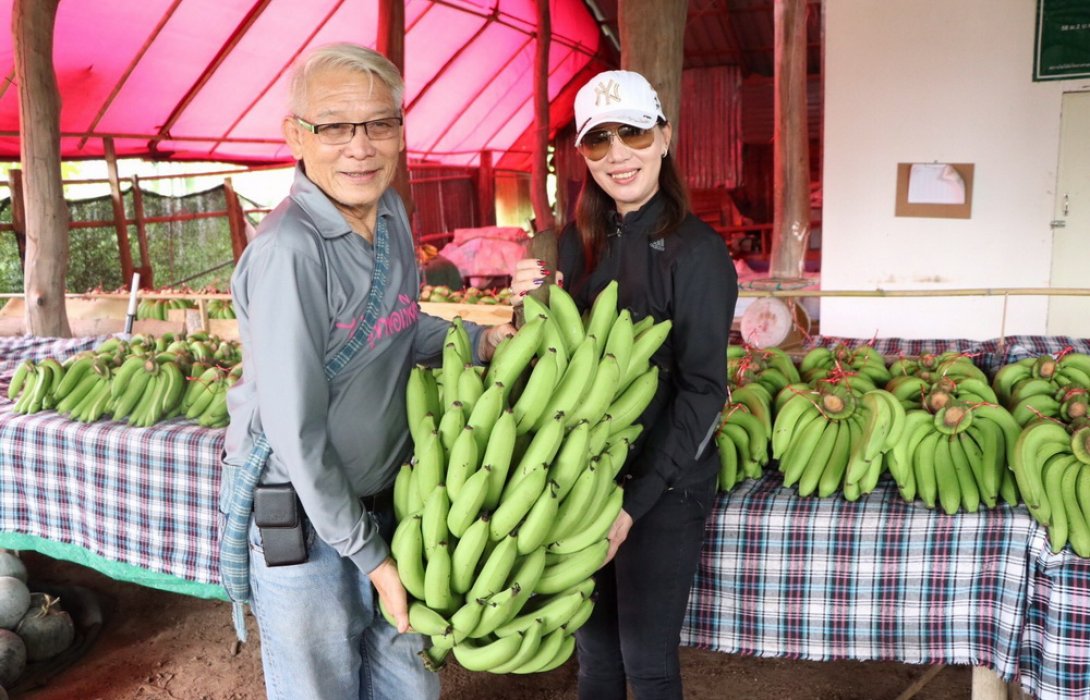 คุณทรงศักดิ์ ปัญญาประชุม เจ้าของไร่สุขพอเพียง จังหวัดสกลนคร เปิดเผยว่า ที่ไร่สุขพอเพียง มีพื้นที่เพาะปลูกประมาณ 70 ไร่ และได้ทำการลูกพืชหลักก็คือ กล้วย และมีพืชแซม ทั้งมะละกอ ฟัก และมะเขือพวง เป็นต้น ซึ่งทางสวนจะเน้นเกษตรอินทรีย์ 100% และได้รับการรับรองจาก GAP (Good Agriculture Practice) หรือที่แปลเป็นไทยว่า การปฏิบัติการเกษตรที่ดี