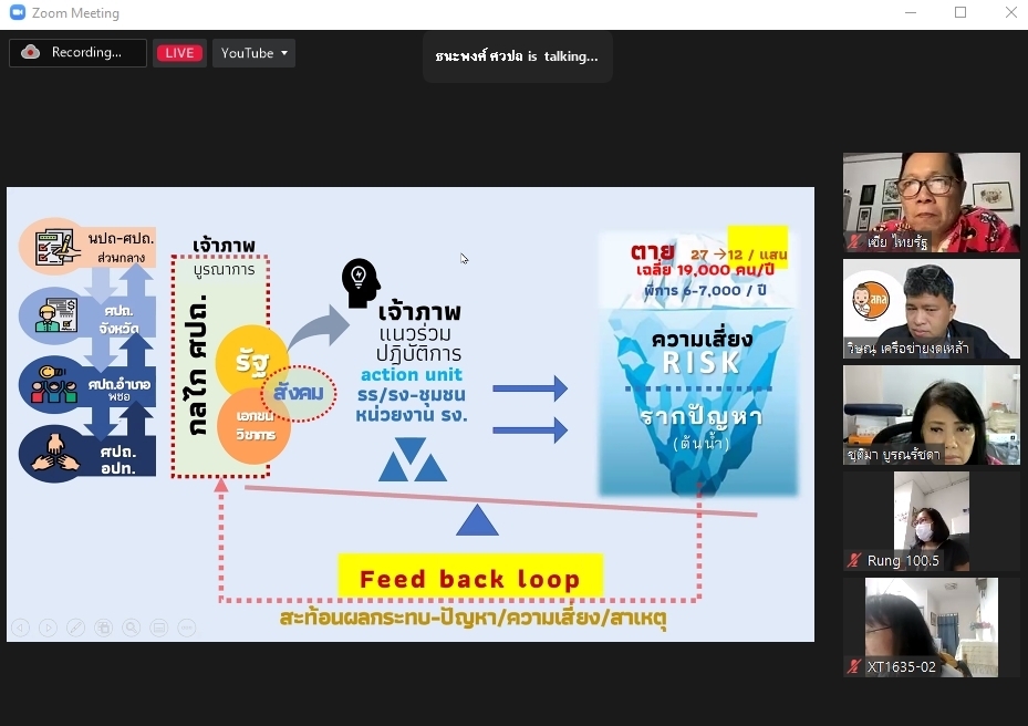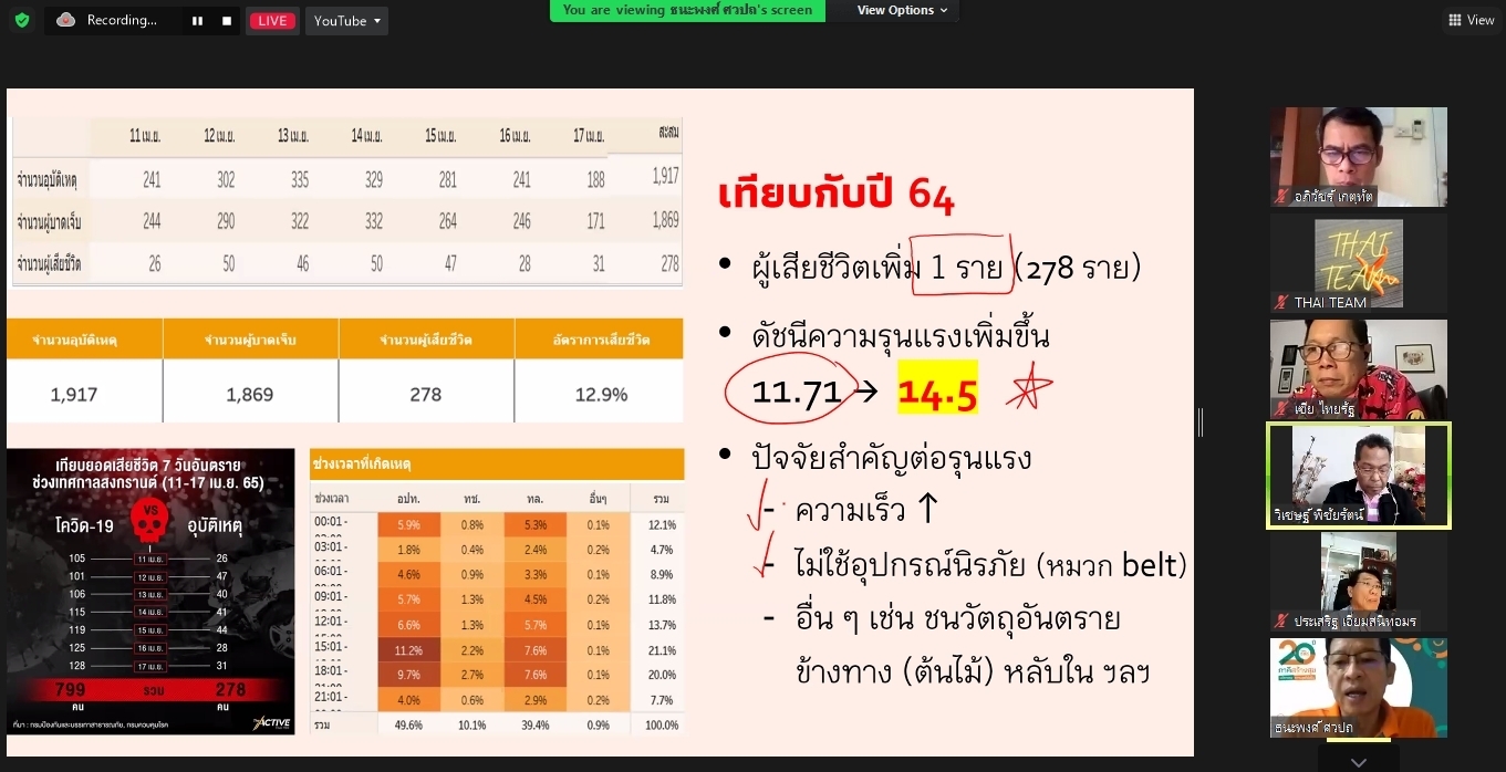 นพ.ธนะพงศ์ จินวงษ์ ผู้จัดการศูนย์วิชาการเพื่อความปลอดภัยทางถนน (ศวปถ.) กล่าวว่าสงกรานต์ปีนี้เริ่มผ่อนคลายมาตรการโควิด การเดินทางจึงเพิ่มขึ้น 6.2 เปอร์เซ็นต์ เทียบกับปี 2564 ที่น่าเป็นห่วงคือความรุนแรงจากอุบัติเพิ่มขึ้น วัดได้จากการเสียชีวิตคาที่เพิ่มจาก 50 เปอร์เซ็นต์ เป็น 60 เปอร์เซ็นต์ สาเหตุหลักมาจากความเร็ว 56.8 เปอร์เซ็นต์ และมีแนวโน้มเพิ่มขึ้น ส่วนการดื่มแอลกอฮอล์แล้วขับนั้นพบว่าคนที่บาดเจ็บ 1 ใน 4 พบแอลกอฮอล์อยู่ในกระแสเลือด แต่ภาพรวม 7 วันอันตราย การดื่มแล้วขับ ที่ทำให้เสียชีวิต ลดลงจาก 21.5 เปอร์เซ็นต์ เหลือ 16.5 เปอร์เซ็นต์ ของผู้เสียชีวิต ส่วนยานพาหนะที่เกิดเหตุรถจักรยานยนต์ยังคงเป็นกลุ่มหลัก รองลงมาคือ รถกระบะ ถ้าเปรียบเทียบความรุนแรงต่อจำนวนครั้งการเกิดเหตุ พบว่ารถกระบะรุนแรงถึงขั้นเสียชีวิตมากว่าจักรยานยนต์ถึง 2.18 เท่า ทั้งนี้เพราะมีปัจจัยเรื่องของความเร็วและการใช้อุปกรณ์นิรภัยร่วมด้วย โจทย์สำคัญที่ต้องหามาตรการป้องกัน คือ แนวโน้มปัญหาความรุนแรงอุบัติเหตุที่เพิ่มสูงขึ้นทั้งในเทศกาลและช่วงปกติ จำเป็นต้องมีมาตรการมาจัดการเรื่องนี้อย่างบูรณาการและเป็นระบบทั้งส่วนกลางและพื้นที่ ทั้งในด้านกายภาพและด้านการบังคับใช้กฎหมาย ซึ่งสื่อมวลชนจะมีบทบาทกระตุ้นส่งสัญญาณให้มีการจัดการและปรับสภาพแวดในพื้นที่เพิ่มบทบาทด่านหน้าคือท้องถิ่นชุมชน หน่วยงานองค์กรต่างๆในการจัดการความเสี่ยงสำคัญ ได้แก่ การลดความเร็ว ไม่ขับจี้ เว้นระยะห่าง ดื่มไม่ขับ และเพิ่มการใช้หมวกนิรภัยและเข็มขัดนิรภัย