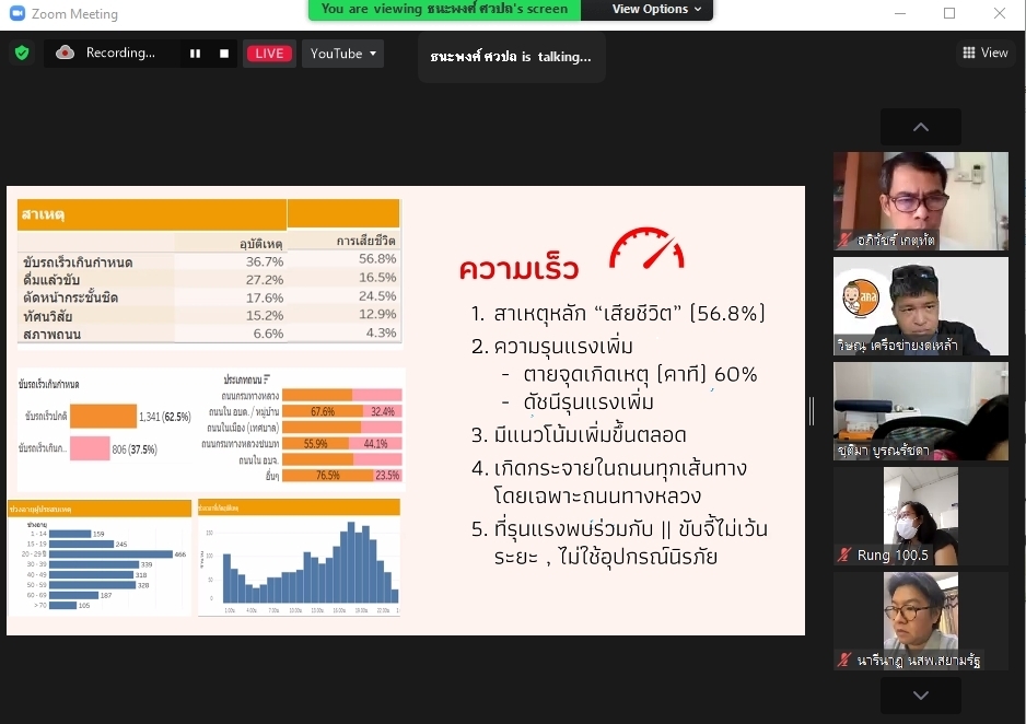นพ.ธนะพงศ์ จินวงษ์ ผู้จัดการศูนย์วิชาการเพื่อความปลอดภัยทางถนน (ศวปถ.) กล่าวว่าสงกรานต์ปีนี้เริ่มผ่อนคลายมาตรการโควิด การเดินทางจึงเพิ่มขึ้น 6.2 เปอร์เซ็นต์ เทียบกับปี 2564 ที่น่าเป็นห่วงคือความรุนแรงจากอุบัติเพิ่มขึ้น วัดได้จากการเสียชีวิตคาที่เพิ่มจาก 50 เปอร์เซ็นต์ เป็น 60 เปอร์เซ็นต์ สาเหตุหลักมาจากความเร็ว 56.8 เปอร์เซ็นต์ และมีแนวโน้มเพิ่มขึ้น ส่วนการดื่มแอลกอฮอล์แล้วขับนั้นพบว่าคนที่บาดเจ็บ 1 ใน 4 พบแอลกอฮอล์อยู่ในกระแสเลือด แต่ภาพรวม 7 วันอันตราย การดื่มแล้วขับ ที่ทำให้เสียชีวิต ลดลงจาก 21.5 เปอร์เซ็นต์ เหลือ 16.5 เปอร์เซ็นต์ ของผู้เสียชีวิต ส่วนยานพาหนะที่เกิดเหตุรถจักรยานยนต์ยังคงเป็นกลุ่มหลัก รองลงมาคือ รถกระบะ ถ้าเปรียบเทียบความรุนแรงต่อจำนวนครั้งการเกิดเหตุ พบว่ารถกระบะรุนแรงถึงขั้นเสียชีวิตมากว่าจักรยานยนต์ถึง 2.18 เท่า ทั้งนี้เพราะมีปัจจัยเรื่องของความเร็วและการใช้อุปกรณ์นิรภัยร่วมด้วย โจทย์สำคัญที่ต้องหามาตรการป้องกัน คือ แนวโน้มปัญหาความรุนแรงอุบัติเหตุที่เพิ่มสูงขึ้นทั้งในเทศกาลและช่วงปกติ จำเป็นต้องมีมาตรการมาจัดการเรื่องนี้อย่างบูรณาการและเป็นระบบทั้งส่วนกลางและพื้นที่ ทั้งในด้านกายภาพและด้านการบังคับใช้กฎหมาย ซึ่งสื่อมวลชนจะมีบทบาทกระตุ้นส่งสัญญาณให้มีการจัดการและปรับสภาพแวดในพื้นที่เพิ่มบทบาทด่านหน้าคือท้องถิ่นชุมชน หน่วยงานองค์กรต่างๆในการจัดการความเสี่ยงสำคัญ ได้แก่ การลดความเร็ว ไม่ขับจี้ เว้นระยะห่าง ดื่มไม่ขับ และเพิ่มการใช้หมวกนิรภัยและเข็มขัดนิรภัย