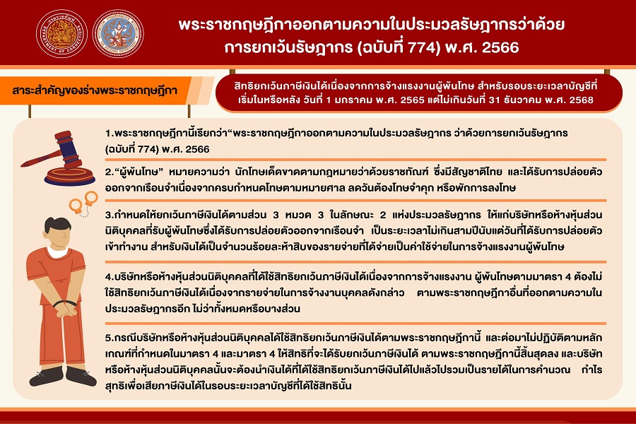 กรมราชทัณฑ์ ร่วมกับ กรมสรรพากร ยกเว้นภาษีเงินได้ ให้แก่บริษัทหรือห้างหุ้นส่วนนิติบุคคลที่รับผู้พ้นโทษเข้าทำงาน