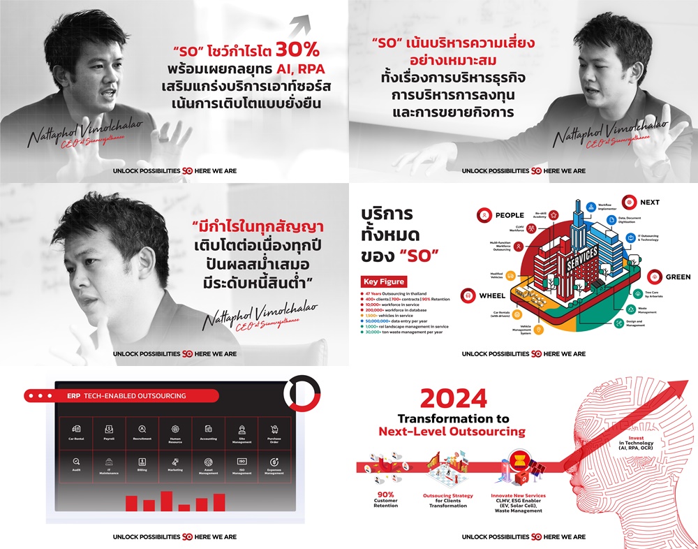 สำหรับกลยุทธเพื่อสร้างโอกาสเติบโตในปี 2567 เราตั้งเป้ารักษาฐานลูกค้าเดิมให้ได้อย่างน้อย 90% และขยายฐานลูกค้ากลุ่มใหม่ๆ โดยการเข้าไปเป็นส่วนหนึ่งของกลยุทธ์การเติบโตของลูกค้าเรา (Strategic Partnership) พร้อมกับการบริหารการลงทุน ด้วยการขยายตลาดในสินค้ากลุ่มใหม่ (New Product Line) เช่น บริการรถยนต์ไฟฟ้า (EV) สำหรับธุรกิจรถเช่าและรถดัดแปลง บริการจัดการพลังงานทางเลือกกลุ่ม Solar Maintenance บริการจัดหาแรงงานกลุ่ม CLMV และเพิ่มการลงทุนในกลุ่มเทคโนโลยีที่มาช่วยต่อยอดธุรกิจเอาท์ซอร์ส (Outsource) ของเรา เช่น เทคโนโลยี Robotic Process Automation (RPA) เทคโนโลยี Enterprise AI และเทคโนโลยี OCR ซึ่งเรามั่นใจว่าจะทำให้ผลประกอบการของ SO ในปี 2567 เติบโตอย่างต่อเนื่อง บนพื้นฐานความแข็งแกร่งทางการเงินของบริษัท พร้อมกับครั้งแรกในการทำ Corporate Branding ภายใต้คอนเซ็ปต์ ‘Unlock Possibilities, SO Here We Are’ ปลดล็อกทุกความเป็นไปได้ เพื่อการเติบโตที่ยั่งยืนสำหรับธุรกิจคู่ค้า และสร้างกำไรที่ยั่งยืนได้อย่างแน่นอน”