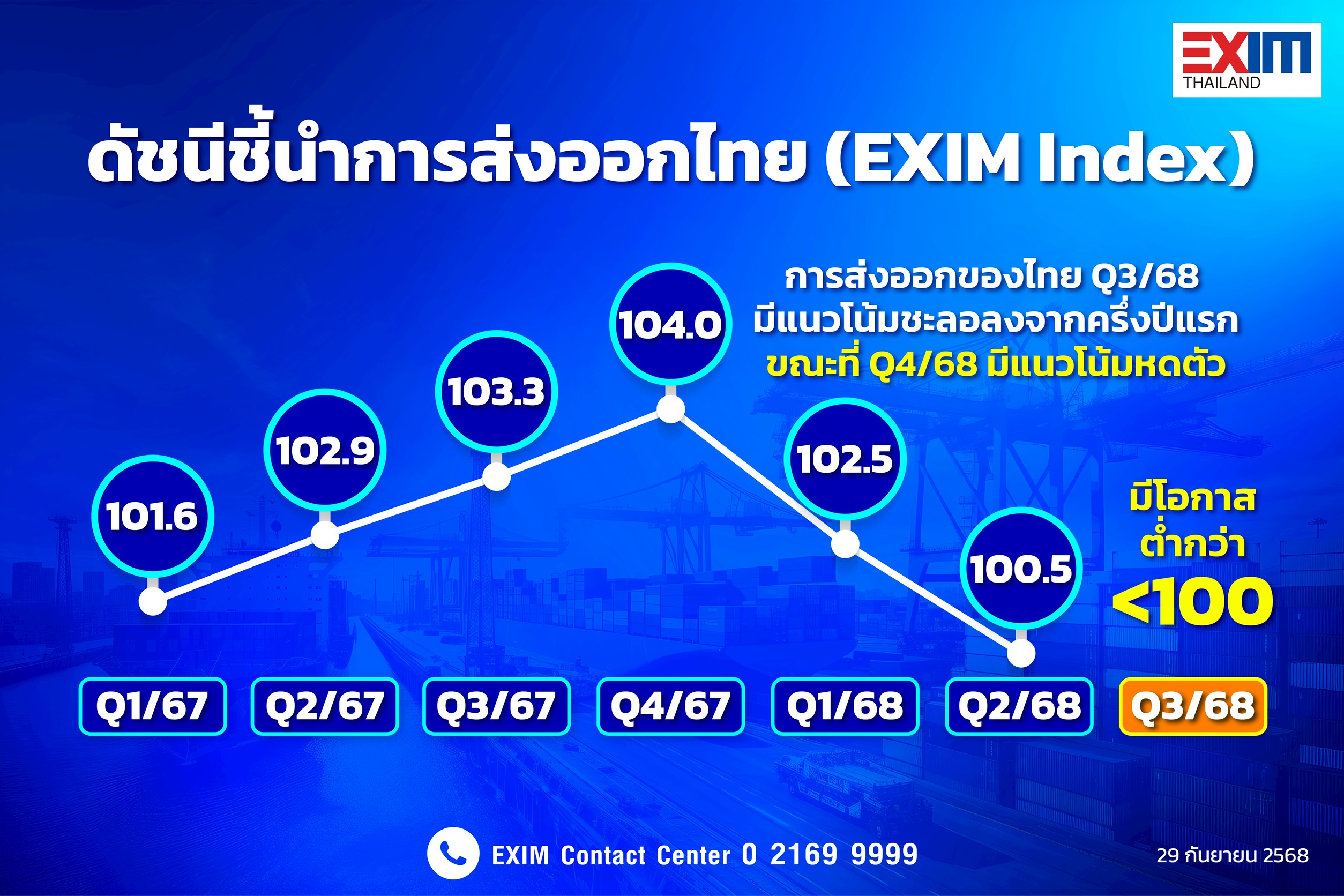 ดร.เบญจรงค์ สุวรรณคีรี รองกรรมการผู้จัดการ EXIM BANK เปิดเผยว่า จากการติดตามสถานการณ์การส่งออกอย่างใกล้ชิดผ่านดัชนีชี้นำการส่งออกของไทย (EXIM Index) ล่าสุดดัชนีมีโอกาสอยู่ในระดับต่ำกว่า 100 ลดลงจากระดับ 100.5 ในไตรมาส 2 สะท้อนแนวโน้มการชะลอตัวชัดเจน โดยมีความไม่แน่นอนของสถานการณ์เศรษฐกิจและการค้าโลก ความขัดแย้งทางภูมิรัฐศาสตร์ในหลายภูมิภาค การเปลี่ยนแปลงสภาพภูมิอากาศ นโยบายกีดกันทางการค้า และการแข็งค่าของเงินบาท เป็นปัจจัยเสี่ยงในระยะข้างหน้า