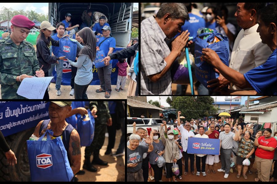 นายประจักษ์ ตั้งคารวคุณ ประธานผู้ก่อตั้ง TOA เผยว่า จากความเสียหายอย่างหนักที่เกิดจากอุทกภัยครั้งใหญ่ในภาคใต้ ซึ่งส่งผลกระทบต่อชีวิตความเป็นอยู่ของพี่น้องประชาชน และระบบสาธารณสุขโดยตรง เราจึงมีความห่วงใยและเข้าใจถึงความยากลำบากที่ทุกคนกำลังเผชิญ จึงพร้อมเป็นส่วนหนึ่งในการสนับสนุน ช่วยเหลือ เยียวยา และฟื้นฟูผู้ประสบอุทกภัยอย่างต่อเนื่องหลังสถานการณ์น้ำท่วมคลี่คลายลง เดินหน้า โครงการ TOA ไม่ทิ้งกัน "รวมพลังไทย ฟื้นฟูน้ำท่วมภาคใต้" ตั้งแต่การลงพื้นที่ช่วยเหลือเยียวยาพี่น้องประชาชนชาวใต้ ในการระดมทีม ‘ทีโอเอ อาสา’ ร่วมกับกำลังทหาร (กอ.รมน.ภาค 4 ส่วนหน้า, กองทัพภาคที่ 4, มณฑลทหารบกที่ 42) ส่งมอบถุงยังชีพกว่า 2,000 ชุด ประกอบด้วย ข้าวสาร บะหมี่กึ่งสำเร็จรูป ปลากระป๋อง ถั่วมารูโจ้ น้ำยาทำความสะอาดทีโพล์ และสเปรย์กำจัดแมลงเชนไดร้ท์ รวมทั้งสิ่งของบรรเทาทุกข์ ผ้าห่มกันหนาว เสื้อยืด น้ำดื่ม และชุดผลิตภัณฑ์ทำความสะอาดทีโพล์ แจกจ่ายให้แก่ประชาชนในพื้นที่ชุมชนต่างๆ ที่ได้รับผลกระทบอย่างทั่วถึง อาทิ ชุมชนบ้านกลางนา ชุมชนอู่ ทส. ชุมชนจันทร์วิโรจน์ ชุมชนบางแฟ้บ ชุมชนบ้านพักรถไฟ ชุมชนศิครินทร์ และชุมชนรายย่อยอื่นๆ รวมทั้งในพื้นที่จังหวัดยะลา และปัตตานี เพื่อเร่งเยียวยา ให้ความช่วยเหลือเข้าถึงทุกคนอย่างทั่วถึงและรวดเร็วที่สุด