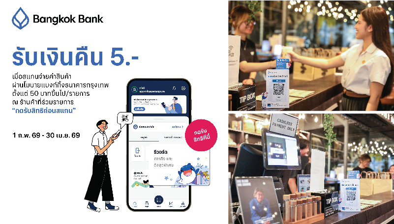 ธนาคารกรุงเทพ จำกัด (มหาชน) ตอกย้ำความร่วมมือกับมหาวิทยาลัยธรรมศาสตร์ เดินหน้าสนับสนุนการเป็น “มหาวิทยาลัยไร้เงินสด” (Cashless Campus) ส่งเสริมการใช้ธุรกรรมดิจิทัล เพิ่มความสะดวกและสิทธิประโยชน์จากการใช้จ่ายในชีวิตประจำวันของนักศึกษาและบุคลากร ด้วยการจัดโปรโมชันพิเศษ Cashless Campus สแกนจ่ายได้เงินคืน เมื่อชำระสินค้าด้วยโมบายแบงก์กิ้งธนาคารกรุงเทพผ่าน QR Code กับร้านค้า Merchant Pro ที่ร่วมรายการ มูลค่าตั้งแต่ 50 บาทขึ้นไปต่อรายการ รับเงินคืน 5 บาทต่อรายการ สูงสุด 5 สิทธิต่อคนต่อเดือน และจำกัดสิทธิรวม 40,000 สิทธิแรกต่อเดือน หรือรวมทั้งสิ้น 120,000 สิทธิ ตลอดโครงการ เริ่มตั้งแต่วันที่ 1 กุมภาพันธ์–30 เมษายน 2569 โดยลูกค้าที่ทำรายการสำเร็จตรงตามเงื่อนไขจะได้รับเงินคืนเข้าบัญชีที่ใช้สแกนจ่ายภายในวันที่ 10 ของเดือนถัดไป ผู้ที่สนใจสามารถเข้าร่วมแคมเปญได้ง่ายๆ เพียงกด “แลกรับสิทธิ” เพื่อลงทะเบียนเข้าร่วมกิจกรรมที่เมนู “รีวอร์ด” บนโมบายแบงก์กิ้งธนาคารกรุงเทพ (ลงทะเบียนเพียงครั้งเดียวตลอดโครงการ)