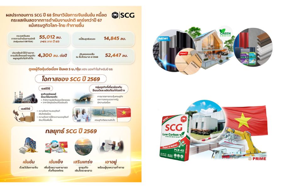 ผลประกอบการเอสซีจีปี 68 รักษาวินัยการเงินเข้มข้น กระแสเงินสดจากการดำเนินงานปกติ ที่ไม่รวมรายการพิเศษ (Adjusted EBITDA) 55,012 ล้านบาท แข็งแกร่งกว่าปี 67 คิดเป็น 6% ขณะที่หนี้ลดลง 14,845 ล้านบาทจากปีก่อน แม้เศรษฐกิจโลกและไทยท้าทายขึ้น ชี้ผลการปรับโครงสร้างธุรกิจ หยุดธุรกิจไม่ทำกำไร และประหยัดค่าใช้จ่าย ได้รวมกว่า 4,300 ล้านบาทต่อปี พร้อมเคาะปันผล 5.0 บาท/หุ้น ดูแลผู้ถือหุ้นต่อเนื่อง ปี 2569 ธุรกิจเคมิคอลส์มีแนวโน้มทรงตัว เนื่องจากกำลังการผลิตใหม่ของโลกลดลง และราคาวัตถุดิบมีแนวโน้มอ่อนตัว เอสซีจีจึงเดินหน้าเข้มข้น ด้วยวินัยการเงิน – เข้มแข็ง เพิ่มขีดความสามารถทั่วองค์กร – เสริมแกร่ง รุกธุรกิจเติบโตระยะยาว มุ่งกลยุทธ์ Regional Optimization ชูเวียดนาม เป็นฐานผลิตรับตลาดในประเทศและส่งออกตลาดโลก พร้อมดันสินค้า SVP - HVA และ Green ที่แนวโน้มเติบโตสูง – เอาอยู่ พร้อมสู้ทุกความท้าทาย