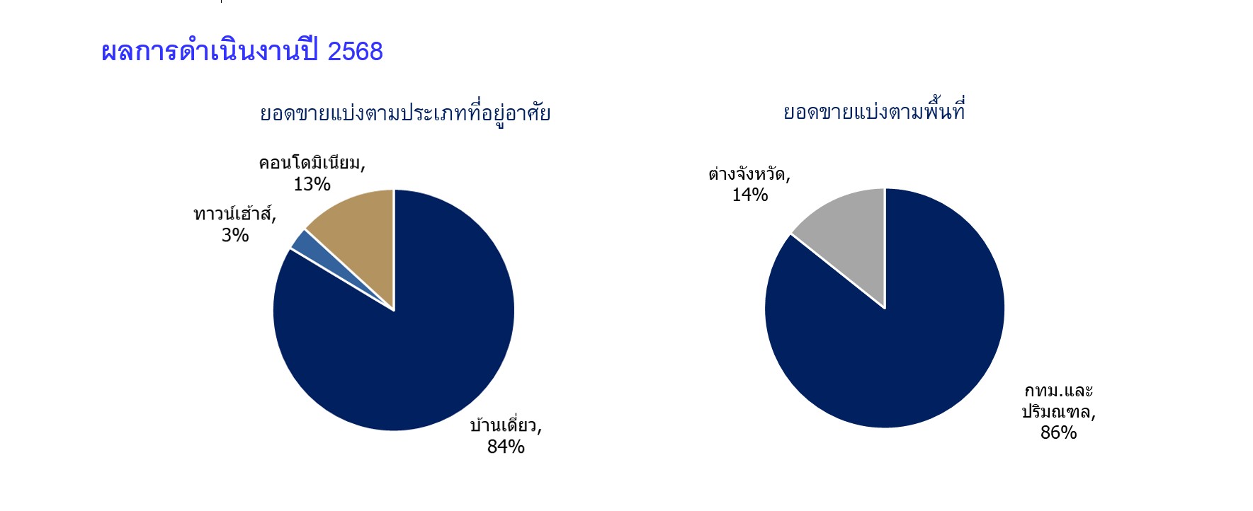 ปี 2568 สินค้าประเภทบ้านแนวราบ ซึ่งได้แก่ บ้านเดี่ยว บ้านแฝดและทาวน์เฮ้าส์ ยังคงเป็นสินค้าหลักที่สร้างยอดขายให้กับบริษัทฯ โดยมีสัดส่วนประมาณ 87% ของยอดขาย ที่เหลืออีกประมาณ 13% เป็นสินค้าคอนโดมิเนียม ซึ่งสินค้ากลุ่มนี้ได้รับผลกระทบจากเหตุการณ์แผ่นดินไหวช่วงปลายเดือนมีนาคม 2568 ทำให้ยอดขายคอนโดมิเนียมได้รับผลกระทบอย่างเห็นได้ชัดในช่วงไตรมาส 2 แต่เริ่มเห็นสัญญาณฟื้นตัวในครึ่งปีหลัง ณ สิ้นปี มีโครงการคอนโดมิเนียมที่ดำเนินการอยู่ทั้งสิ้น 6 โครงการ มูลค่าขายคงเหลือรวมกว่า 11,000 ล้านบาท และโครงการบ้านแนวราบอีกกว่า 65,000 ล้านบาท