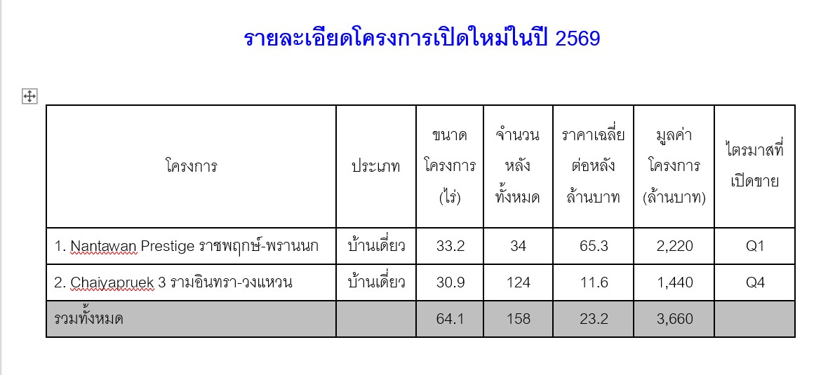 ในปี 2569 บริษัทฯ วางแผนเปิดโครงการใหม่ 2 โครงการ ได้แก่ Nantawan Prestige ราชพฤกษ์-พรานนก บ้านเดี่ยวระดับราคา 60-100 ล้านบาท และ Chaiyapruek 3 รามอินทรา-วงแหวน บ้านเดี่ยวระดับราคา 10-13 ล้านบาท มูลค่ารวมของโครงการใหม่ประมาณ 3,660 ล้านบาท