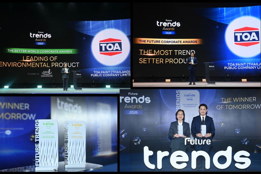 บริษัท ทีโอเอ เพ้นท์ (ประเทศไทย) จำกัด (มหาชน) หรือ TOA ผู้นำนวัตกรรมรักษ์โลกของอุตสาหกรรมสีอันดับ 1 เคมีภัณฑ์ก่อสร้าง และวัสดุตกแต่งพื้นผิวครบวงจรของไทย เดินหน้าสร้างประวัติศาสตร์ความสำเร็จอย่างต่อเนื่อง ล่าสุดคว้าเพิ่ม 2 รางวัลใหญ่บนเวที Future Trends Awards 2026 ได้แก่ รางวัลสุดยอดองค์กรผู้นำเทรนด์ “The Most Trend Setter Product” และรางวัลองค์กรยอดเยี่ยมด้านนวัตกรรมรักษ์โลก และความเป็นเลิศด้าน ESG “Leading of Environmental Product” สะท้อนภาพลักษณ์องค์กรแห่งอนาคตที่มุ่งเน้นนวัตกรรมและการเติบโตอย่างยั่งยืน ภายใต้แนวคิด "Knowing Future, Be The Winner of Tomorrow" เพื่อมอบให้กับองค์กร แบรนด์ ผลิตภัณฑ์ และบุคคลแห่งอนาคต ผู้สร้างสรรค์นวัตกรรมใหม่ๆ เพื่อประกาศ และเชิดชูความสําเร็จให้แก่แบรนด์ที่มีความคิดริเริ่มสร้างสรรค์งานที่มีความโดดเด่น ซึ่งก่อให้เกิดคุณค่าต่อสังคมเป็นวงกว้าง