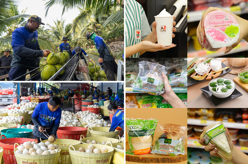 นอกจากนี้ เซเว่นฯ ยังเปิดพื้นที่ให้คู่ค้า และผู้ประกอบการ SME ไทยนำมะพร้าวจากเกษตรกรมาต่อยอดเป็นสินค้าแปรรูปหลากหลาย เช่น ผลิตภัณฑ์ขนมหวานที่ใช้วัตถุดิบจากกะทิ หรือเครื่องดื่มและอาหารที่มีส่วนประกอบจากมะพร้าว ทำให้สินค้าเข้าถึงผู้บริโภคผ่านร้านเซเว่น อีเลฟเว่นใกล้บ้านได้มากขึ้น