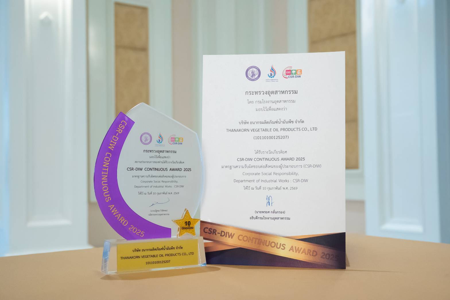 นายเพชร หวั่งหลี กรรมการผู้จัดการ บริษัท ธนากรผลิตภัณฑ์น้ำมันพืช จำกัด เข้ารับรางวัล CSR-DIW Continuous Award ประจำปี 2569 จาก ดร.ณัฐพล รังสิตพล ปลัดกระทรวงอุตสาหกรรม จัดโดยกรมโรงงานอุตสาหกรรม กระทรวงอุตสาหกรรม ซึ่งมอบให้แก่สถานประกอบการที่ให้ความสำคัญในการส่งเสริมสนับสนุนการดำเนินงาน และปฏิบัติตามมาตรฐานความรับผิดชอบต่อสังคม (Corporate Social Responsibility : CSR) ได้อย่างครบถ้วน โดยงานในครั้งนี้ได้รับเกียรติจาก นายธนกร วังบุญคงชนะ รัฐมนตรีว่าการกระทรวงอุตสาหกรรม เป็นประธานในพิธีมอบโล่รางวัลดังกล่าว ณ ห้องรอยัล จูบิลี่ บอลรูม อาคารชาเลนเจอร์ อิมแพคเมืองทองธานี จังหวัดนนทบุรี เมื่อวันที่ 25 มีนาคม 2569
