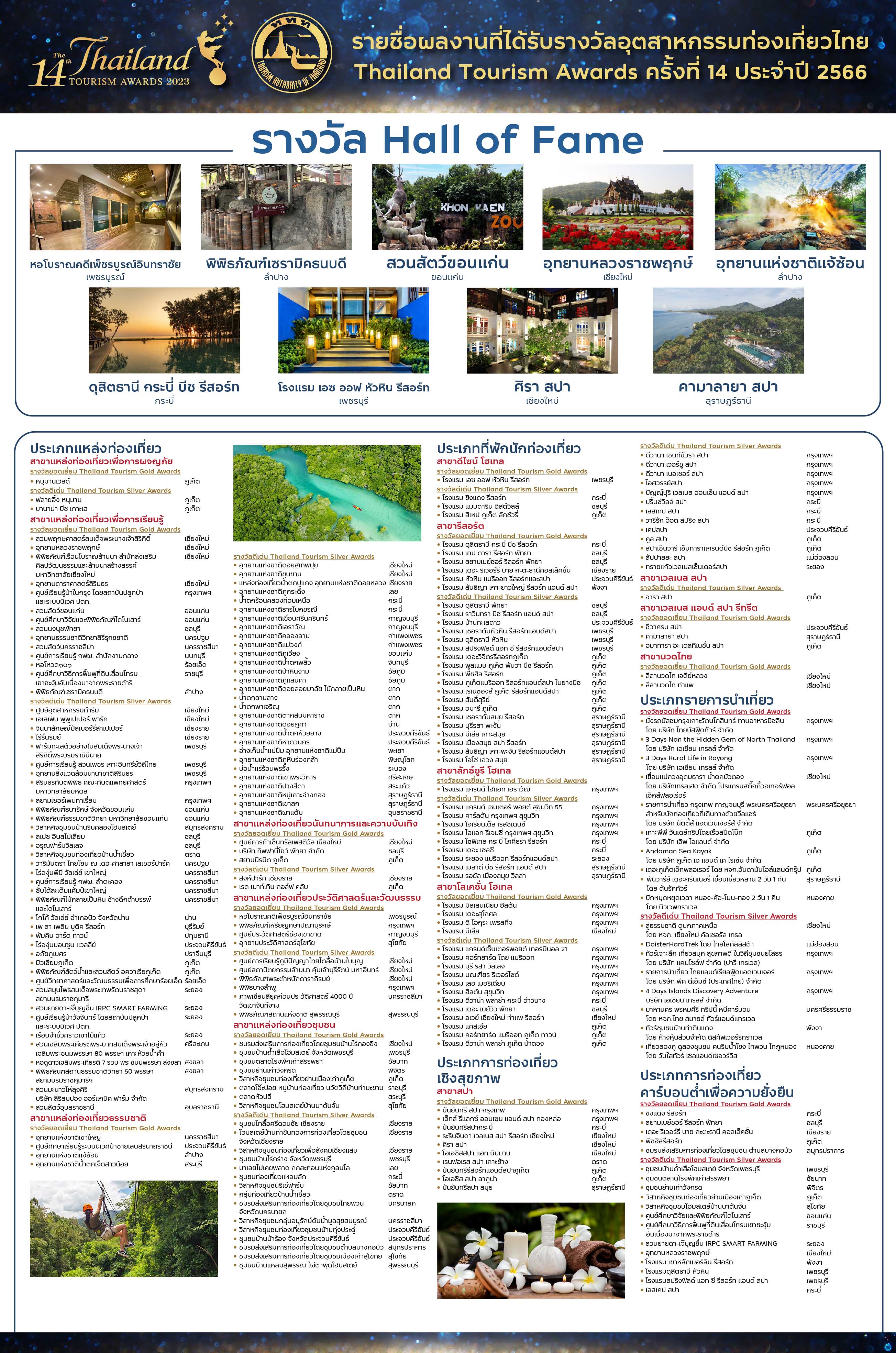 สำหรับรางวัลอุตสาหกรรมท่องเที่ยวไทย ครั้งที่ 14 ประจำปี 2566 มีผู้ประกอบการส่งผลงานสมัครเข้าร่วมโครงการฯ จำนวนทั้งสิ้น 908 ราย จาก 5 ประเภทรางวัล ประกอบด้วย ประเภทแหล่งท่องเที่ยว ประเภทที่พักนักท่องเที่ยว ประเภทการท่องเที่ยวเชิงสุขภาพ ประเภทรายการนำเที่ยว และประเภทการท่องเที่ยวคาร์บอนต่ำเพื่อความยั่งยืน และมีผู้ที่ผ่านการคัดเลือกชนะรางวัล รวมทั้งสิ้น 353 ราย โดยแต่ละประเภทได้รับคัดสรรผลงานที่มีคุณภาพ แบ่งเป็น 3 สาขารางวัล ได้แก่ รางวัล Thailand Tourism Gold Award (ยอดเยี่ยม) Thailand Tourism Award (ดีเด่น) และเกียรติบัตรรางวัลอุตสาหกรรมท่องเที่ยวไทย (Thailand Tourism Certificate) ซึ่งมีรายละเอียด ดังนี้ รางวัลประเภท Thailand Tourism Gold Award (ยอดเยี่ยม) จำนวน 76 ราย รางวัล Thailand Tourism Silver Award (ดีเด่น) 169 ราย และ เกียรติบัตรรางวัลอุตสาหกรรมท่องเที่ยวไทย 99 ราย ทั้งนี้ผู้ประกอบการที่ได้รับรางวัล Thailand Tourism Gold Award ต่อเนื่องกัน 3 ครั้ง จะได้รับมอบรางวัล Hall of Fame โดยในปี 2566 นี้มีจำนวนรวม 9 ราย ได้แก่ หอโบราณคดีเพ็ชรบูรณ์อินทราชัย จ.เพชรบูรณ์, พิพิธภัณฑ์เซรามิคธนบดี จ.ลำปาง, สวนสัตว์ขอนแก่น จ.ขอนแก่น, อุทยานหลวงราชพฤกษ์ จ.เชียงใหม่, อุทยานแห่งชาติแจ้ซ้อน จ.ลำปาง, ดุสิตธานี กระบี่ บีช รีสอร์ต จ.กระบี่, โรงแรมเอซ ออฟ หัวหิน รีสอร์ท จ.เพชรบุรี, ศิรา สปา จ.เชียงใหม่, คามาลายา สปา จ.สุราษฎร์ธานี ทั้งนี้ พิธีพระราชทานรางวัลอุตสาหกรรมท่องเที่ยวไทย ครั้งที่ 14 ในวันที่ 27 กันยายน 2566 จะมีการมอบรางวัลแก่ผู้ผ่านการคัดเลือกชนะรางวัลในสาขารางวัล Thailand Tourism Gold Award (ยอดเยี่ยม) Thailand Tourism Award (ดีเด่น) และรางวัล Hall of Fame จำนวนทั้งสิ้น 254 ราย