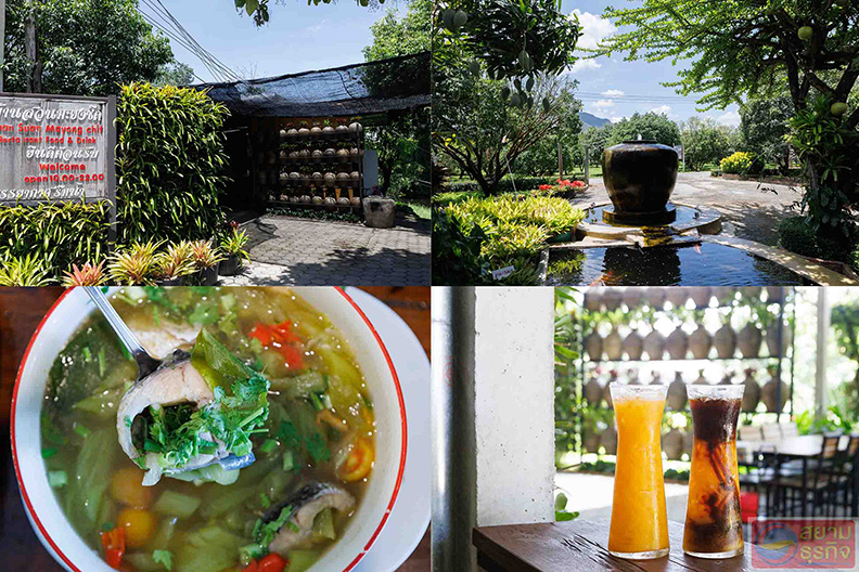 ในร้านยังมีเสิร์ฟอาหารอีกหลากหลายรายการ ภายใต้บรรยากาศร่มรื่น มองเห็นวิวภูเขา วันนี้ได้ลองเมนูเด็ดจากวัตถุดิบท้องถิ่นอย่าง “แกงตูน” ซึ่งมีลักษณะของปลาต้มกับคูนและเครื่องสมุนไพรหอม ๆ “ตูน” หรือ “คูน” เป็นพืชตระกูลบอนที่กินได้ ปลูกง่ายตามบ้านเรือนทั่วไป เมนูนี้รสชาติเบา ๆ กลมกล่อม ได้สัมผัสหนุบหนับจากคูน นอกจากนั้นยังมีเมนูเมี่ยงปลาสมุนไพร ไข่ตุ๋นหม้อไฟ น้ำพริกอ่อง ฯลฯ