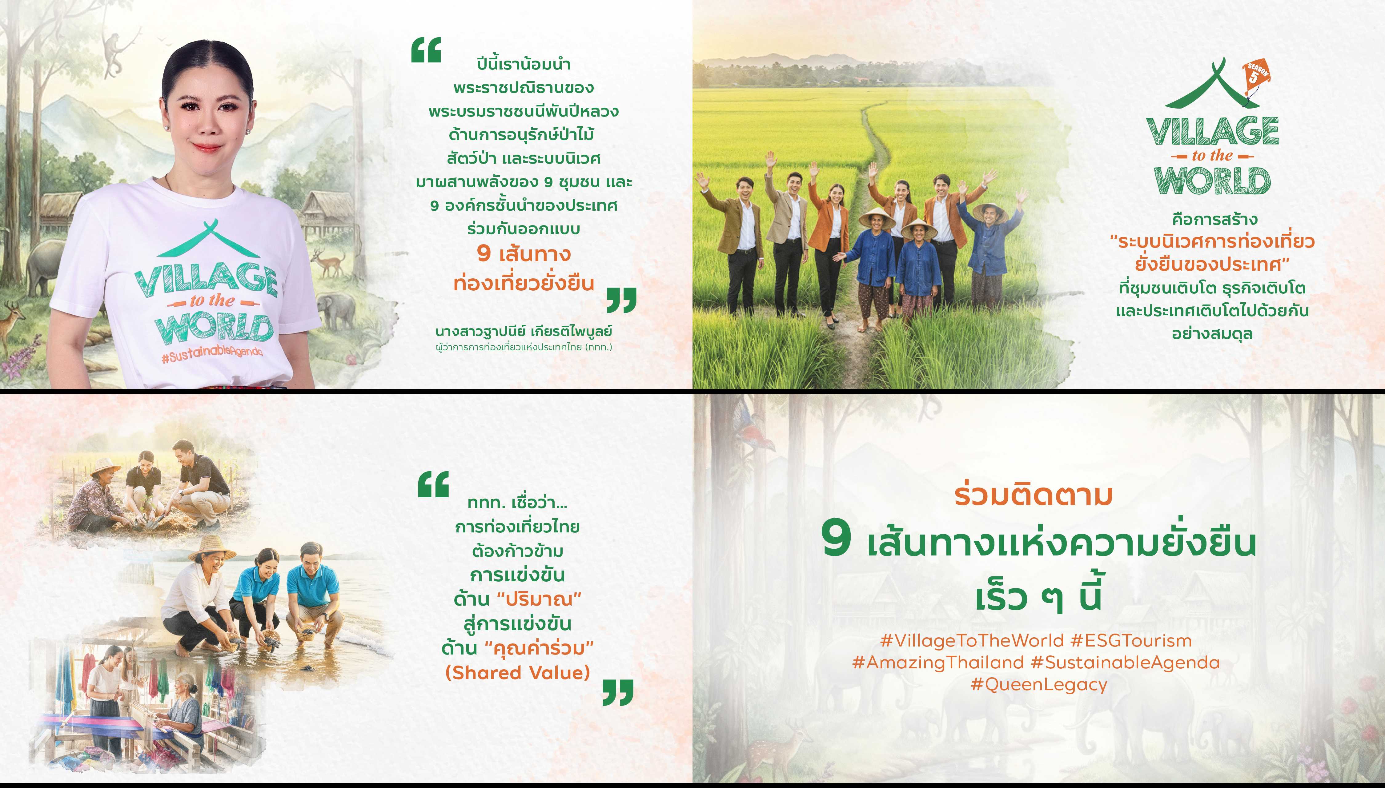 การท่องเที่ยวแห่งประเทศไทย (ททท.) เดินหน้าสานต่อโครงการ Village to the World Season 5 #SustainableAgenda #QueenLegacy น้อมนำแนวพระราชปณิธานด้านการอนุรักษ์ทรัพยากรธรรมชาติของ สมเด็จพระนางเจ้าสิริกิติ์ พระบรมราชินีนาถ พระบรมราชชนนีพันปีหลวง มาบูรณาการกับ 9 ชุมชนท่องเที่ยวและ 9 องค์กรชั้นนำของประเทศ ร่วมวางรากฐานโมเดลการท่องเที่ยวเชิงคุณค่า ภายใต้แนวคิด Shared Value และ ESG Tourism มุ่งยกระดับระบบนิเวศการท่องเที่ยวยั่งยืน พร้อมขับเคลื่อนการสื่อสารผ่านเครือข่ายสื่อมวลชนและจัดทำข้อมูลเชิงประจักษ์ เพื่อผลักดันชุมชนไทยสู่การยอมรับในระดับสากล