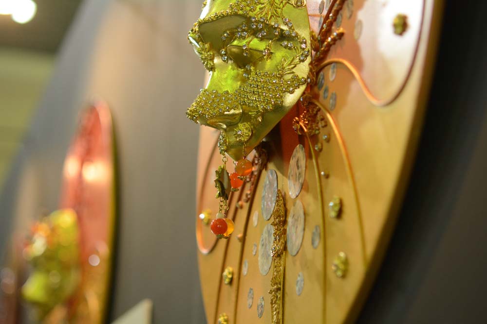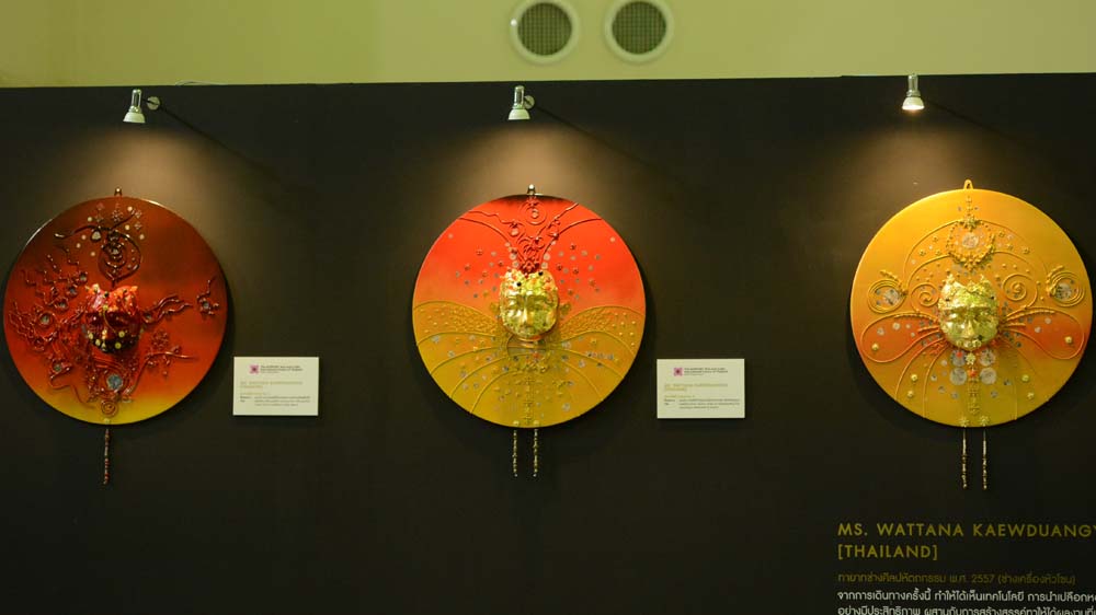 “วัฒนา แก้วดวงใหญ่” ทายาทช่างศิลป์หัตถกรรม พ.ศ. 2557 (ช่างเครื่องหัวโขน) กับผลงาน“อุเบกขา” ที่ไล่ระดับความทุกข์และการปล่อยวางของมนุษย์ ใน 3 ระดับ ซึ่งสีแดงหมายถึงความทุกข์ ส่วนสีทองหมายถึงการหลุดพ้นและปล่อยวาง