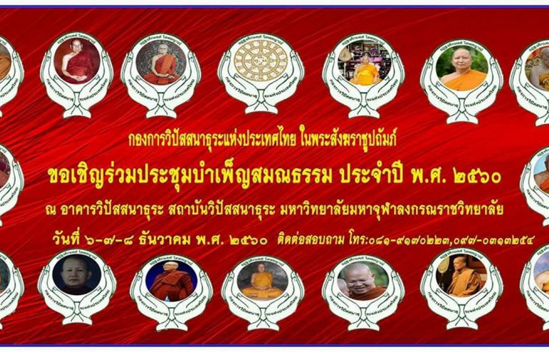 พระครูธรรมธรสัมพันธ์ ถิรธมโม รองเลขาธิการ ปฏิบัติหน้าที่แทนเลขาธิการกองการ วิปัสสนาธุระ กองการวิปัสสนาธุระแห่งประเทศไทย ในพระสังฆราชูปถัมภ์ ขอเชิญคณะศิษยานุศิษย์ร่วมงานบำเพ็ญกุศล๑๑๔ปีชาตกาลสมเด็จพระพุฒาจารย์(อาจอาสภมหาเถร)อดีตผู้อำนวยการใหญ่กองการวิปัสสนาธุระแห่งประเทศไทย ผู้ปฏิบัติหน้าที่สมเด็จพระสังฆราช ร่วมประชุมบำเพ็ญสมณธรรม ถือธุดงค์ ปฏิบัติธรรม ระหว่างพระวิปัสสนาจารย์ ผู้ปฏิบัติธรรมกองการวิปัสสนาธุระแห่งประเทศไทย ในพระสังฆราชูปถัมภ์ ณ อาคาร วิปัสสนาธุระสมเด็จพระพุฒาจารย์ มหาวิทยาลัยมหาจุฬาลงกรณราชวิทยาลัยตำบลลำไทร อำเภอวังน้อย จังหวัดพระนครศรีอยุธยา ในวันที่ ๖_๗_๘ ธันวาคม ๒๕๖๐ โทร ๐๘๑ ๙๑๗ ๐๒๒๓ _๐๙๗ ๐๓๑ ๓๒๕๔