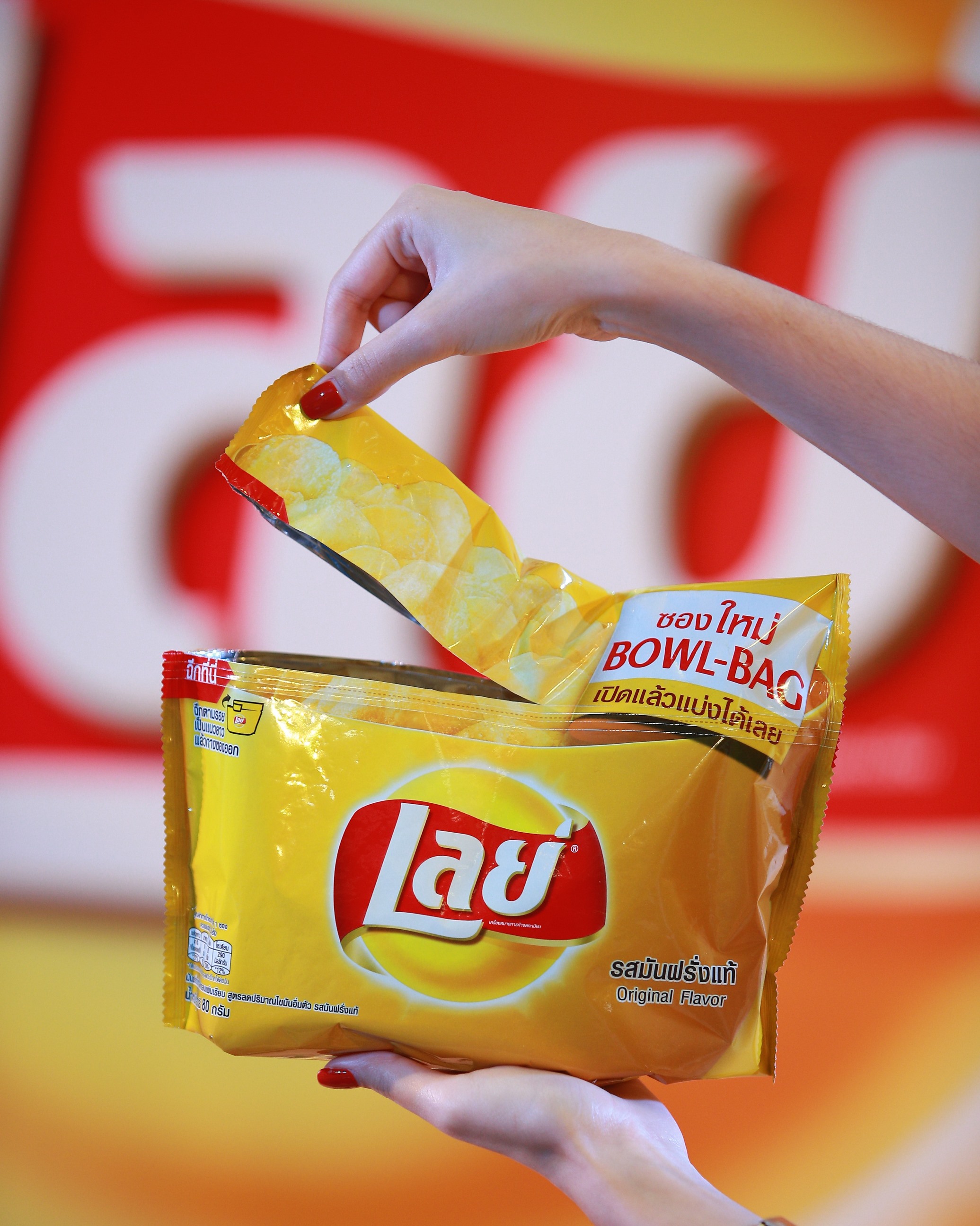 สำหรับไฮไลท์สำคัญของ “เลย์โบว์ล – แบ็ค” (Lay’s Bowl – Bag)อยู่ที่ความโดดเด่นของบรรจุภัณฑ์ที่ผสมผสานความเป็นซองและชามในหนึ่งเดียวมาพร้อมฟังก์ชั่นพิเศษ“ฉีกง่าย – ตั้งได้ – ซองเปิดกว้าง –แชร์ความอร่อยได้พร้อมกัน” ซึ่งตอบโจทย์พฤติกรรมของผู้บริโภคให้สามารถบริโภคมันฝรั่งทอดกรอบเลย์ได้อย่างสะดวก ล้วงหยิบง่ายไม่เลอะมือ และสามารถแบ่งความอร่อยให้กับคนรอบข้างได้พร้อมกัน มาพร้อม3 รสชาติยอดนิยม ไม่ว่าจะเป็น เลย์รสมันฝรั่งแท้ ทั้งแบบแผ่นเรียบและแผ่นหยัก เลย์แผ่นหยักกลิ่นเอ็กซ์ตร้าบาร์บีคิว และเลย์แผ่นเรียบรสโนริสาหร่าย ในราคา 39 บาท โดยจะวางจำหน่ายในร้านค้าทั่วไปร้านสะดวกซื้อ ซูเปอร์มาร์เก็ต และห้างสรรพสินค้าชั้นนำทั่วประเทศ