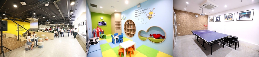 สำหรับกลยุทธ์การสร้าง ‘ความสุข’ ในการทำงานของพนักงานที่โรบินสันให้ความสำคัญเป็นอันดับแรก นั่นก็คือ การสร้างสภาพแวดล้อมและสิ่งอำนวยความสะดวกภายในองค์กร เพื่อตอบสนองไลฟ์สไตล์ในการทำงานขอพนักงาน เนื่องจากเป็นวันธรรมดาของการทำงานที่พนักงานจะเกิดความตึงเครียด การมีพื้นที่ทำงานที่นอกเหนือจากโต๊ะทำงานและพื้นที่พักผ่อนจะเป็นเสมือนการช่วยให้พนักงานได้ผ่อนคลายทั้งร่างกายและจิตใจ อย่างเช่น ในสาขาสุดอย่าง ‘ศูนย์การค้าโรบินสันไลฟ์สไตล์ ชลบุรี’ ที่โรบินสันได้มีการพัฒนา ‘Staff Facilities’ รูปโฉมใหม่ เพือทำให้ชีวิตการทำงานของพนักงานมีความสุขมากขึ้น ทั้ง โซน Working Space & Workshop ที่พนักงานสามารถมานั่งทำงานเพื่อหาแรงบันดาลใจ และไอเดียใหม่ๆ รวมทั้งประชุม และพบปะพูดคุย โดยมีบริการ Free Wifi และสิ่งอำนวยความสะดวก อาทิ โต๊ะทำงาน ปลี๊กไฟ และจุดชาร์จแบตเตอรี่มือถือ ที่ครบครัน โซนห้องอาหาร ที่นอกจากจะขายอาหารในราคาถูก สะอาด และถูกสุขอนามัยแล้ว โรบินสันยังได้เนรมิตบรรยากาศภายในโซนนี้ให้เป็นร้าน   อาหารเก๋ๆ ที่นอกจากจะมีโต๊ะอาหารสำหรับรับรองพนักงานแล้ว ยังมีทั้งมุมเคาน์เตอร์บาร์ และโซฟาที่แสนสบาย เสมือนได้มานั่งแฮงเอ้าท์กับเพื่อนๆ เพื่อจะได้ชาร์จพลังกลับไปทำงานต่อในช่วงบ่าย นอกจากนี้ยังมีโซนที่น่าสนใจอีกมากมาย ไม่ว่าจะเป็น โซนกีฬา สำหรับให้พนักงานได้ยืดเส้นยืดสาย และได้ใช้เวลาว่างให้เป็นประ โยชน์ด้วยการออกกำลังกายร่วมกัน และสำหรับพนักงานที่เป็นคุณพ่อ – คุณแม่ ยังมีโซน Children Care ไว้ในกรณีที่พาเจ้าตัวน้อยมาทำงานด้วย ซึ่งสะอาด และปลอดภัย