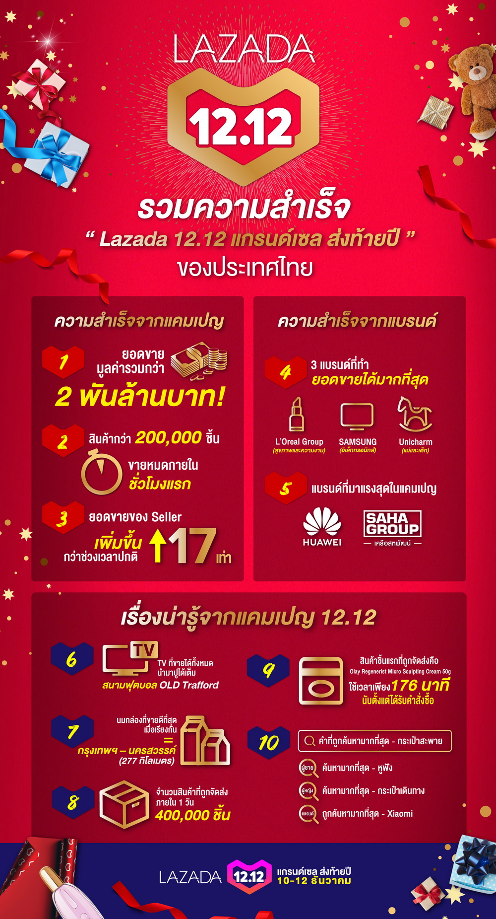 ลาซาด้าบริษัทอีคอมเมิร์ซระดับแนวหน้าในเอเชียตะวันออกเฉียงใต้ เผยสถิติของประเทศไทยด้วยยอดขายสินค้าจากเทศ กาลช้อปปิ้ง 12.12 พุ่งสูงกว่า 2พันล้านบาท เพิ่มขึ้นกว่า 71 เท่า เมื่อเทียบกับช่วงเวลาเดียวกันของปีที่แล้ว นอกจากนี้ลาซาด้าทั้งภูมิภาคยังคงทำลายสถิติอย่างต่อเนื่อง โดยสามารถดึงดูดผู้เยี่ยมชมแพลตฟอร์มทั่วทั้ง 6 ประเทศในเอเชียตะวันออกเฉียงใต้ได้ถึง 1.3 พันล้านรายในช่วงเทศกาลช้อปปิ้ง 11.11 และ 12.12 ที่ผ่านมา