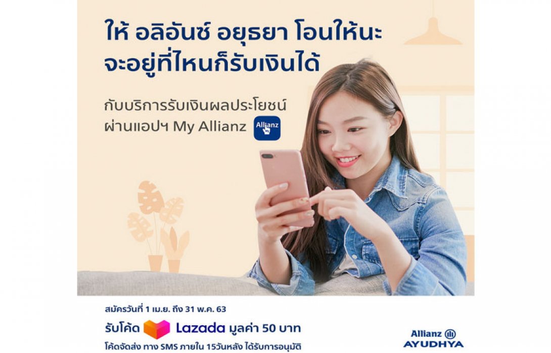 อลิอันซ์ อยุธยา ให้คุณรับเงินผลประโยชน์ได้ง่ายๆ อยู่ที่ไหนก็รอรับเงินได้ กับบริการรับเงินผลประโยชน์ ผ่านแอปพลิเคชัน My Allianz สมัครได้ทันที ไม่ต้องส่งเอกสาร เพียงเข้าแอปฯ กดสมัครขอรับเงินผลประโยชน์ผ่านบัญชีธนาคาร กรอกรายละเอียดให้ครบถ้วน และรอรับเงินได้ภายใน 2 สัปดาห์ สมัครได้ตั้งแต่วันนี้ – 31 พ.ค. 63 พร้อมรับโค้ด Lazada มูลค่า 50 บาท (หมดอายุในวันที่ 30 กันยายน 2563) สำหรับช้อปปิ้งออนไลน์ เพียงดาวน์โหลดแอปฯ My Allianz ซึ่งใช้ได้ทั้งในระบบ IOS และ Android อ่านรายละเอียดเพิ่มเติมได้ที่ https://bit.ly/MayDCA