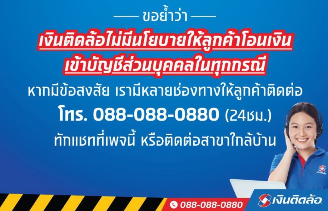 เตือนภัย! ขณะนี้มีมิจฉาชีพแอบอ้างนำชื่อและโลโก้เงินติดล้อไปใช้ทำสื่อ Social media ปลอม เช่น Facebook และ LINE เพื่อหลอกให้ผู้ขอสินเชื่อโอนเงินค่าสมัครหรืออื่นๆ ทั้งนี้ บริษัท เงินติดล้อ จำกัด (มหาชน) ขอแจ้งให้ลูกค้าและผู้ขอสินเชื่อทราบว่า บริษัทฯ ไม่มีนโยบายเก็บค่าสมัครขอสินเชื่อ หรือให้ลูกค้าโอนเงินเข้าบัญชีส่วนบุคคลไม่ว่ากรณีใดๆ