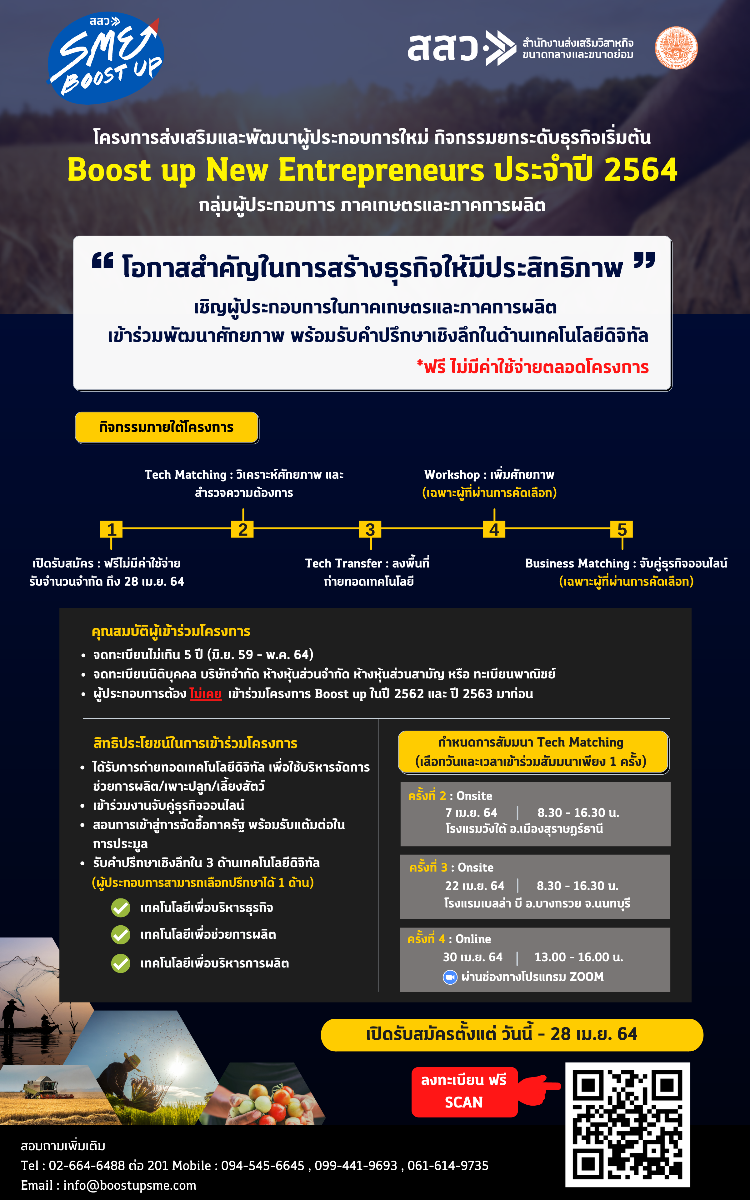 ผอ. สสว. เผยอีกว่า สำหรับการดำเนินงานของสสว. ก็ได้มีการปรับเปลี่ยนและปรับปรุงให้เหมาะสม ทั้งนี้ โครงการยกระดับธุรกิจเริ่มต้น (Boost Up New Entrepreneurs) ปี 2564 ได้จัดขึ้นโดยมีวัตถุประสงค์หลักในการช่วยพัฒนาศักยภาพของผู้ประกอบการเอสเอ็มอี และให้การสนับสนุนผลักดันสินค้าของผู้ประกอบการแต่ละราย ให้เติบโตในตลาดได้อย่างมีประสิทธิภาพ โดยร่วมกับทีมที่ปรึกษาของโครงการ มหาวิทยาลัยเทคโนโลยีพระจอมเกล้าพระนครเหนือ ในการจัดกิจกรรมต่างๆ ในรูปแบบออนไลน์ และออฟไลน์ ทั้งการสัมมนา การให้คำปรึกษาเชิงลึก และการทำเวิร์กชอปร่วมกัน