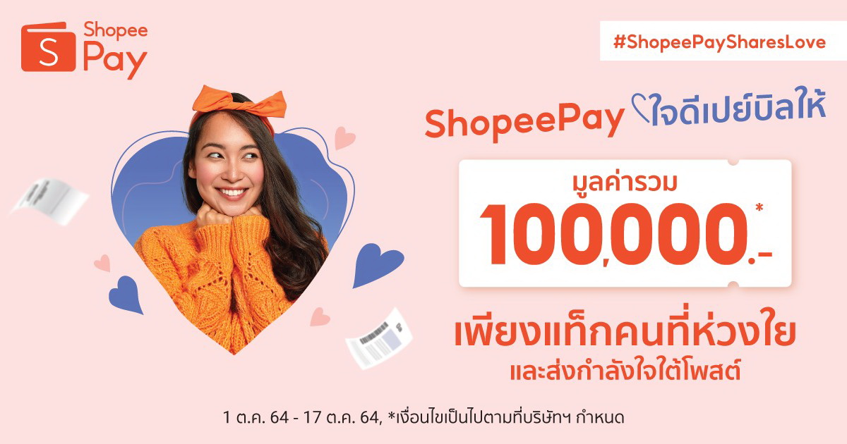โดยแท็กชื่อคนที่คุณห่วงใยที่สุด และเขียนข้อความส่งต่อกำลังใจ พร้อมใส่ Hashtag #ShopeePayTH #ShopeePaySharesLove ใต้โพสต์ของกิจกรรม  ‘ShopeePay ใจดีเปย์บิลให้’ บนเฟซบุ๊กแฟนเพจ ShopeePay โดย 50 ข้อความที่โดนใจที่สุด รับเลย! คูปองจ่ายบิลฟรีทุกประเภทสูงสุด 1,000 บาท สำหรับใช้จ่ายบนแอปพลิเคชันช้อปปี้ โดยจะมอบให้ทั้งผู้ที่แท็กและถูกแท็ก เป็นจำนวนรวมทั้งสิ้น 100 คูปอง รวมมูลค่ากว่า 100,000 บาท (ประกาศรายชื่อผู้โชคดีวันที่ 19 ตุลาคมนี้)