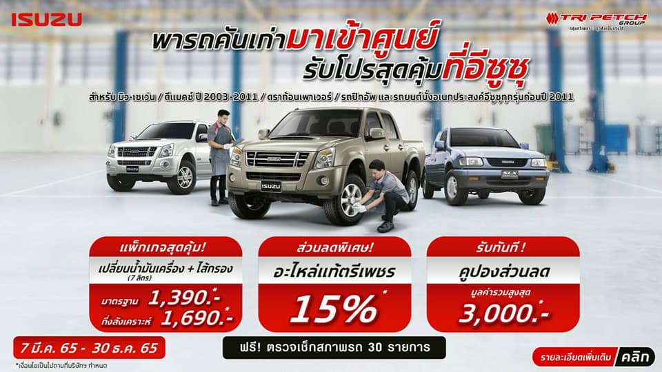 โปรโมชันพิเศษทั้ง 3 คุ้มนี้สามารถใช้ร่วมกันได้ โดยสามารถเข้ารับบริการได้ตั้งแต่วันที่ 7 มีนาคม 2565 - 30 ธันวาคม 2565 สอบถามเพิ่มเติมที่ศูนย์บริการมาตรฐานอีซูซุทั่วประเทศ หรือสายด่วนลูกค้าสัมพันธ์ โทร. 0-2118-0777 หรือที่ https://www.isuzu-tis.com/.../news.../old-car-campaign/