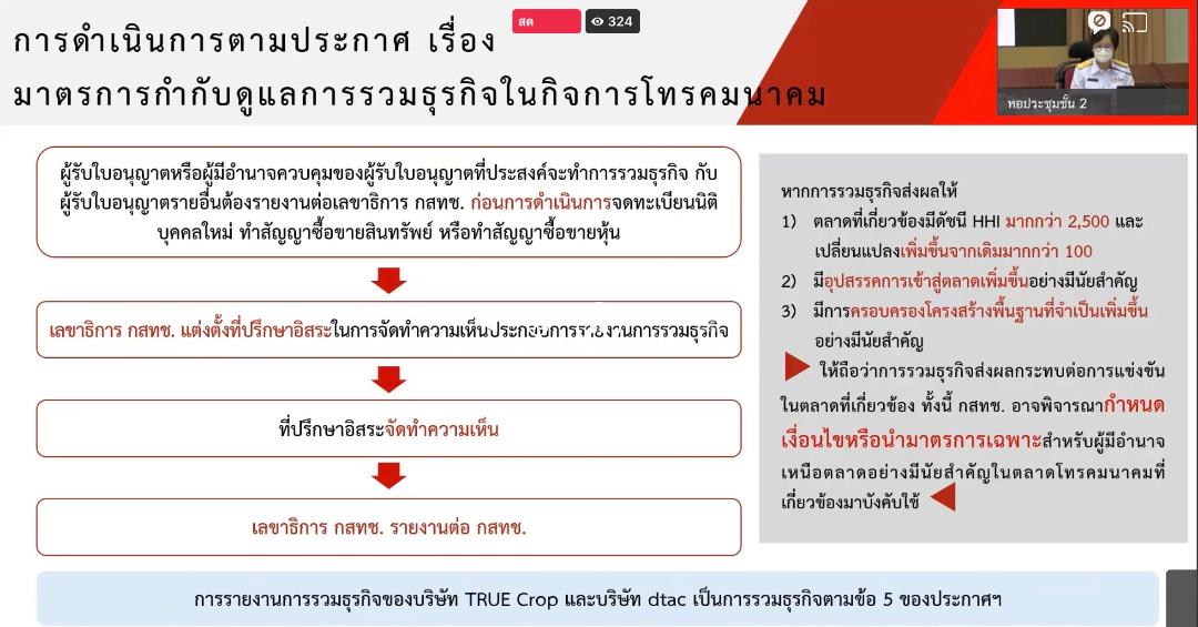 ต่อมาในวันที่ 9 พฤษภาคม 2565 บนเวทีการประชุมรับฟังความคิดเห็นสาธารณะในวงจำกัด(Focus Group)เกี่ยวกับกรณีควบรวมทรูดีแทค นางสาวจิตสถา ศรีประเสริฐสุข ผู้ช่วยเลขาธิการ กสทช. ได้ชี้แจงรายละเอียดยิบ เกี่ยวกับการควบรวมทรูและดีแทค ก่อนการเปิดให้รับฟังความคิดเห็นสาธารณะ โดยให้ข้อมูลว่า “การดำเนินการควบรวมของทรูและดีแทคนั้น เป็นไปตามประกาศเรื่อง การกำกับดูแลการควบรวมกิจการโทรคมนาคม โดยมี 4 ขั้นตอนคือ ผู้รับใบอนุญาต ที่ประสงค์จะทำการรวมกิจการกับผู้รับใบอนุญาตรายอื่น ต้องรายงานต่อเลขาธิการ กสทช. ก่อนการดำเนินการจดทะเบียนนิติบุคคลใหม่ ทำสัญญาซื้อขายสินทรัพย์ หรือ ทำสัญญาซื้อขายหุ้น โดย ขั้นที่สองคือ กสทช. จะดำเนินการแต่งตั้งที่ปรึกษาอิสระ ซึ่งได้ดำเนินการไปแล้ว ในการจัดทำความเห็นประกอบรายงานการรวมธุรกิจ ในขั้นที่สามคือ ที่ปรึกษาอิสระจัดทำความเห็น และ ในขั้นตอนสุดท่ายคือ เลขาธิการ กสทช. รายงานต่อ กสทช. ซึ่งถือว่า บทบาทของกสทช. ได้ดำเนินการตามกฎหมายทุกประการ นอกจากนี้ หากการรวมธุรกิจส่งผลให้ 1) ตลาดที่เกี่ยวข้อมีดัชนี HHI มากกว่า 2,500 และ เปลี่ยนแปลงเพิ่มขึ้นจากเดิมมากกว่า 100 2) มีอุปสรรคการเข้าสู่ตลาดเพิ่มขึ้นอย่างมีนัยสำคัญ และ 3) มีการครอบครองโครงสร้างพื้นฐานที่จำเป็นเพิ่มขึ้นอย่างมีนัยสำคัญ ทั้งนี้ กสทช. อาจพิจารณากำหนดเงื่อนไข หรือนำมาตรการเฉพาะ สำหรับผู้มีอำนาจเหนือตลาดอย่างมีนัยสำคัญในตลาดโทรคมนาคมที่เกี่ยวข้องมาบังคับใช้”