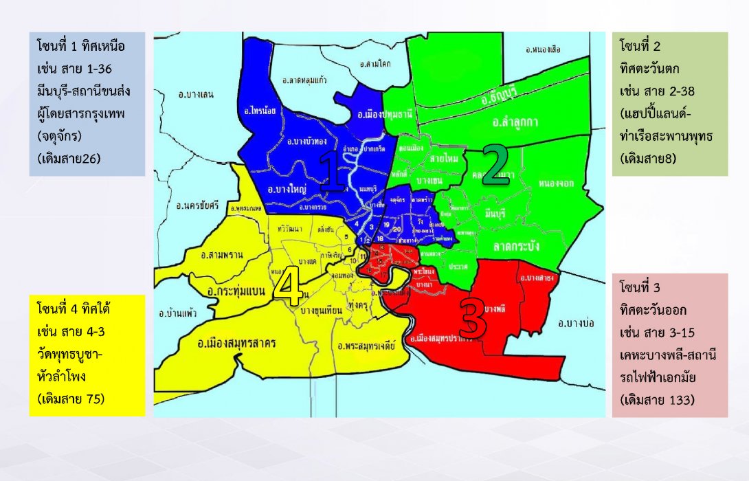 โดยเลขสายรถเมล์จะแบ่งเป็น 4 โซน ใช้หลักการแบ่งพื้นที่การเดินรถของจุดต้นทางตามทิศของกรุงเทพมหานคร คือ เลขแรกเป็นเลขโซน และตัวเลขหลังเป็นเลขสาย โซนที่ 1 ทิศเหนือ (กรุงเทพฯ โซนเหนือและตะวันออกเฉียงเหนือ ถนนพหลโยธิน) ขึ้นต้นด้วย 1-เลขสาย (1-1 ถึง 1-68), โซนที่ 2 ทิศตะวันตก (กรุงเทพฯ ชั้นในและโซนตะวันตกเฉียงเหนือ) ขึ้นต้นด้วย 2–เลขสาย (2-1 ถึง 2-56), โซนที่ 3 ทิศตะวันออก (กรุงเทพฯ โซนตะวันออกเฉียงใต้ : ถนนสุขุมวิท) ขึ้นต้นด้วย 3-เลขสาย (3-1 ถึง 3-56) และโซนที่ 4 ทิศใต้ (กรุงเทพฯ โซนใต้และตะวันตกเฉียงใต้ ถนนเพชรเกษม) ขึ้นต้นด้วย 4-เลขสาย (4-1 ถึง 4-71) ซึ่งแตกต่างจากหมายเลขสายรถเดิมที่มีการเรียงตัวเลขสายไปเรื่อยๆ เมื่อมีเส้นทางใหม่ก็เพิ่มตัวเลขเข้าไป ขณะที่สายรถเมล์ใหม่นี้จะมีเลขโซนอยู่ด้านหน้า