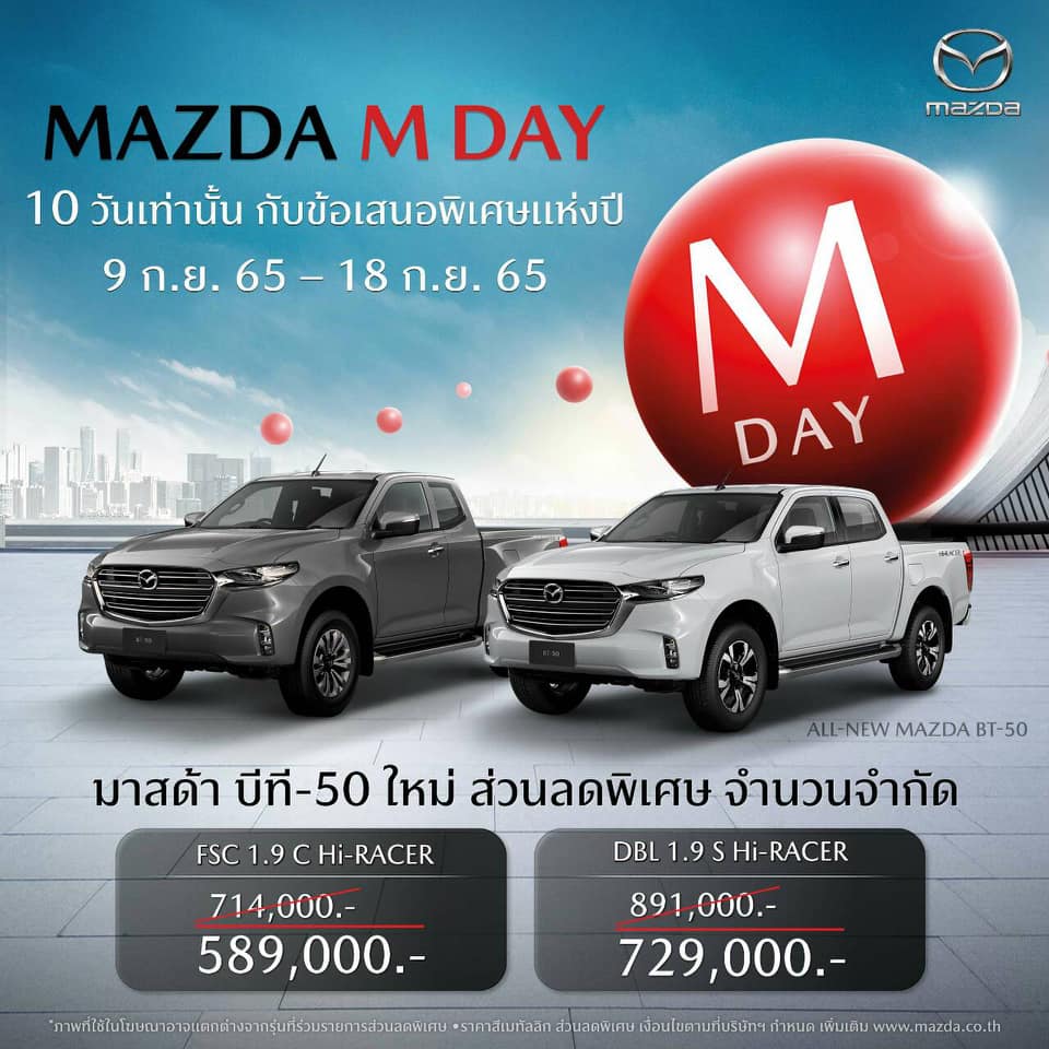 นายธีร์ กล่าวเพิ่มเติมว่าในเดือนกันยายนนี้มาสด้า ส่งแคมเปญข้อเสนอสุดพิเศษแห่งปี ต้อนรับลูกค้าที่ต้องการเข้ามาเป็นส่วนหนึ่งกับครอบครัวมาสด้า ด้วยแคมเปญ MAZDA M DAY มอบฟรีแพ็กเกจบำรุงรักษา MAZDA CARE 5 ปี* ฟรีบัตรเติมน้ำมันสูงสุด 10,000 บาท* ฟรีประกันภัยชั้นหนึ่ง Mazda Premium Insurance 1 ปี* และลูกค้า 500 ท่าน แรก ที่จองรถมาสด้าทุกรุ่นภายในงาน รับฟรี Mazda Luggage มูลค่า 3,500 บาท1 และราคาพิเศษ มาสด้า บีที-50 ใหม่ ในรุ่น FSC 1.9 C Hi-RACER ราคาเพียง 589,000 บาท และ DBL 1.9 S Hi-RACER ราคาเพียง 729,000 บาท (จำนวนจำกัด) ระหว่างวันที่ 9-18 ก.ย. 65 นอกจากนั้น มาสด้ายังมอบข้อเสนอชุดแต่งแห่งปี 65 กับส่วนลดพิเศษ 10% ชุดแต่งรอบคัน2 และผ่อนชำระ 0% นานสูงสุด 10 เดือน3 ระหว่างวันที่ 1-30 ก.ย. 65 ที่โชว์รูมมาสด้าทั่วประเทศ