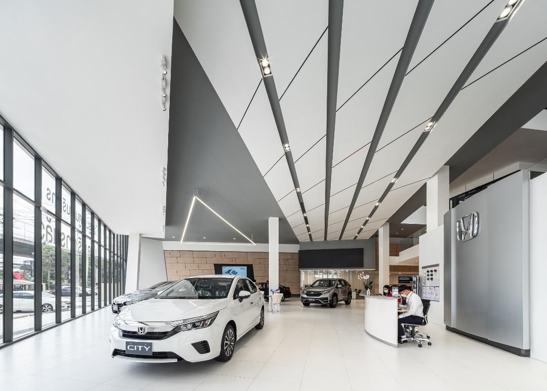 โชว์รูมเป็นอาคารสามชั้น โดยมีชั้นลอยเป็นพื้นที่รองรับลูกค้า ทำหน้าที่เชื่อมการมองเห็นทั่วอาคาร หลังคาสูงโปร่ง กว้างขวาง มีการเว้นระยะอย่างเหมาะสม พร้อมรองรับกิจกรรมทางการตลาดได้หลากหลาย ทั้งตกแต่งด้วยไม้ที่ช่วยสร้างบรรยากาศที่อบอุ่นและเป็นกันเอง ผสานการใช้เทคโนโลยีดิจิทัล ด้วยการใช้จอภาพขนาดต่างๆ ติดตั้งในหลายแผนกทั่วบริเวณ ลดการใช้กระดาษเพื่อรักษาสิ่งแวดล้อม และสามารถสื่อสารกับลูกค้าผ่านภาพนิ่งและภาพเคลื่อนไหว ได้อย่างมีประสิทธิภาพ