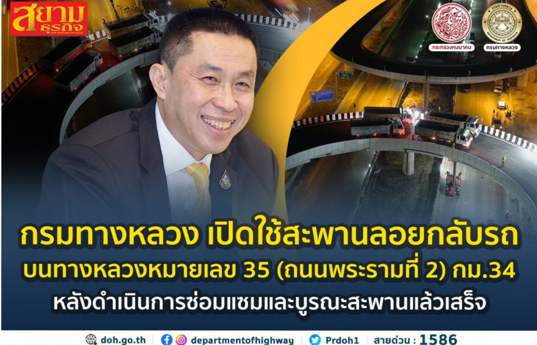 กรมทางหลวง เปิดใช้สะพานลอยกลับรถบนทางหลวงหมายเลข 35 (ถนนพระรามที่ 2) กม.34 หลังดำเนินการซ่อมแซมและบูรณะสะพานแล้วเสร็จ ด้าน วสท. ยืนยัน ผลทดสอบความสามารถในการรับน้ำหนักบรรทุกของสะพานเป็นไปตามมาตรฐานและที่กฎหมายกำหนด