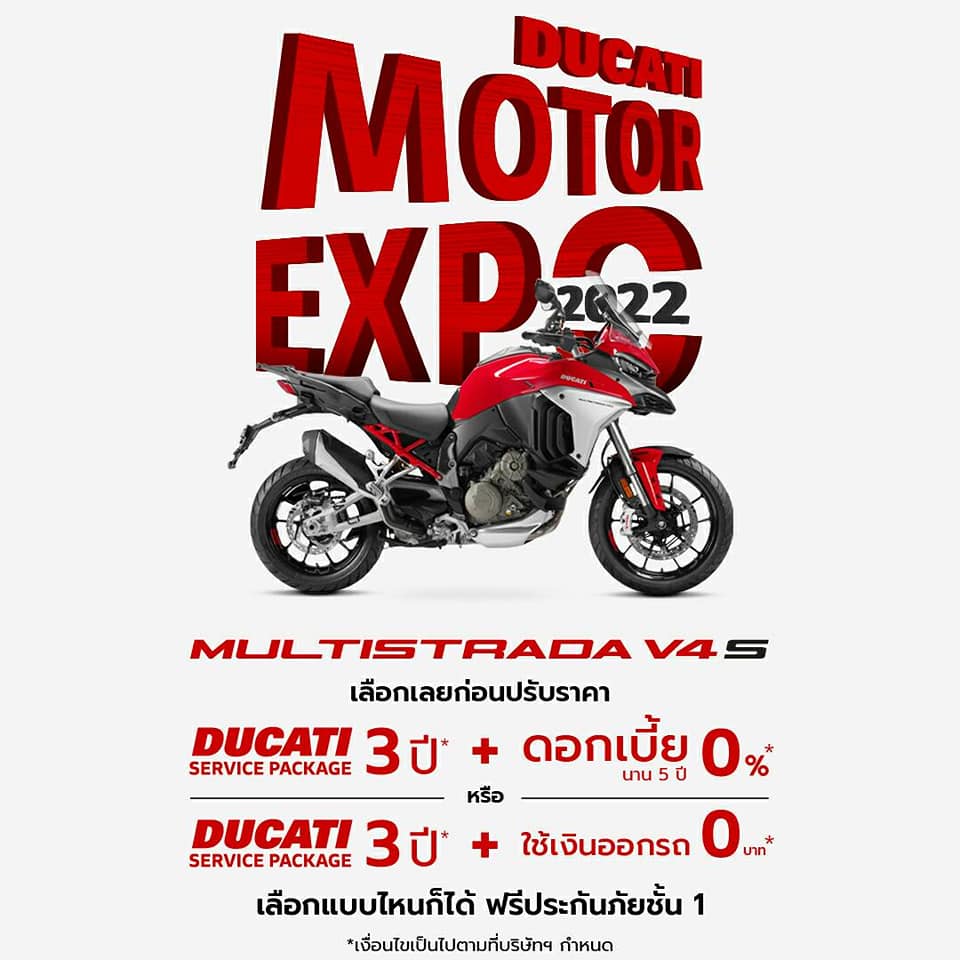 เพื่อเป็นการต้อนรับงานมหกรรมยานยนต์ Thailand International Motor Expo 2022 ที่จะเริ่มขึ้นในเดือนธันวาคมนี้ บริษัท โมโตเร อิตาเลียโน จำกัด พร้อมแล้วที่จะต้อนรับลูกค้ากับแคมเปญใหญ่สุดคุ้มแห่งปี “Ducati Motor Expo” ที่โชว์รูม ดูคาติ ทุกสาขา ซึ่งเป็นข้อเสนอเดียวกับในงานฯ สำหรับรถที่จองและส่งมอบตั้งแต่วันนี้ จนถึง 31 ธันวาคมนี้ โดยลูกค้าสามารถเลือกได้ ทั้ง Ducati Service package 3 ปี หรือ ดาวน์ 0 บาท หรือ ดอกเบี้ย 0% นาน 5 ปี ซึ่งแคมเปญนี้ ถือว่าเป็นแคมเปญที่คุ้มค่าทุกด้าน โดยเฉพาะราคานับว่าถูกสุดๆ ก่อนที่จะมีการปรับราคาขึ้นทุกรุ่นในปีหน้า