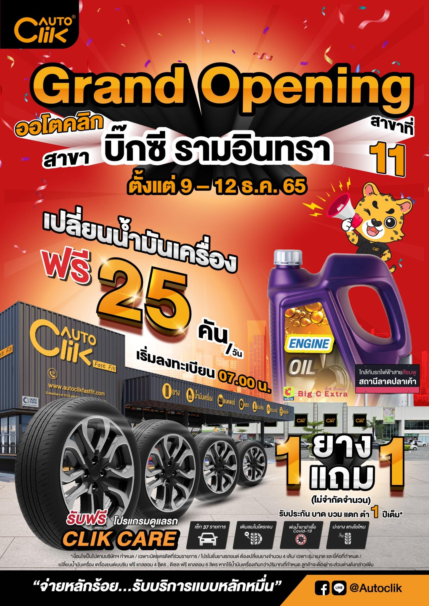 และมอบโปรโมชั่นพิเศษฉลองเปิดสาขาใหม่ 4 วันเต็ม สำหรับฉลองเปิดสาขาใหม่ อาทิเช่น เปลี่ยนน้ำมันเครื่อง พร้อมไส้กรองฟรี จำนวนจำกัด 25 คัน/วัน (เริ่มเปิดลงทะเบียนเวลา 07.00 น. เป็นต้นไป) ยางรถยนต์ 1 แถม 1 และ ยางรถยนต์ 3 แถม 1 ไม่จำกัดจำนวน พร้อมรับประกันยาง บาด บวม แตก ตำ 1 ปีเต็ม เปลี่ยนแบต เบรก โช๊คอัพ ลด 25% เฉพาะรุ่นและยี่ห้อที่กำหนด รวมถึงล้างแอร์สุดคลีน มีให้เลือก 2 แบบ คือ แบบที่ 1 ล้างแอร์ในราคา 1,998 บาท แถมฟรี กรองแอร์คาร์บอน หรือ แบบที่ 2 ล้างแอร์ลด 15% เหลือเพียง 1,698 บาท พร้อมเสริมด้วยโปรโมชั่นผ่อน 0% นานสูงสุด 10 เดือน เฉพาะบัตรเครดิตที่เข้าร่วมรายการ (โปรโมชั่นยาง 1 เเถม 1 ไม่เข้าร่วมรายการผ่อนชำระ) ทั้งนี้ เงื่อนไขเป็นไปตามบริษัทกำหนด สอบถามโปรโมชั่นเพิ่มเติม ได้ที่ Facebook Fanpage : Autoclik หรือ โทร. 02-0278874