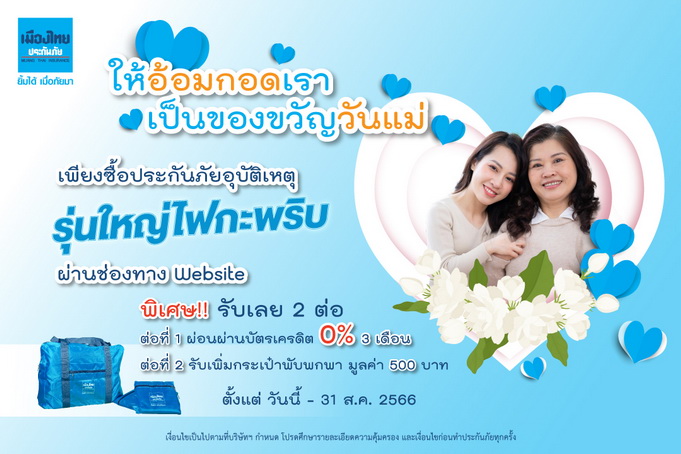 ต้อนรับเดือนสิงหาคม เดือนแห่งวันแม่ ที่ลูกหลายคนกำลังมองหาของขวัญพิเศษเพื่อมอบแด่คนพิเศษ เมืองไทยประกันภัย ตอกย้ำการเป็นผู้นำบริษัทด้านประกันวินาศภัยไทย ที่คิดค้นผลิตภัณฑ์และบริการให้ตอบโจทย์และมีประสิทธิภาพสูงสุดแก่ผู้บริโภคในทุกกลุ่ม ส่งผลิตภัณฑ์ประกันภัยอุบัติเหตุรุ่นใหญ่ ไฟกะพริบ มอบความคุ้มครองกลุ่มผู้ใหญ่วัยเตรียมเกษียณ จนถึงวัยหลังเกษียณ หากเกิดอุบัติเหตุ เช่นลื่นหกล้ม ได้รับบาดเจ็บ คุ้มครองค่ารักษาพยาบาลสูงสุด 80,000 บาทต่อครั้ง หากกระดูกแตกหัก น้ำร้อนลวก รับเพิ่มสูงสุด 50,000 บาท ชดเชยรายได้ 1,500 บาทต่อวัน นอน รพ. 7 วัน รับเพิ่มสูงสุด 10,000 บาท คุ้มครองสูงสุด 1 ล้านบาท เบี้ยฯเริ่มต้นเพียง 3,800 บาท พร้อมโปรโมชั่นพิเศษรับวันแม่ แบบคุ้ม 2 ต่อ สำหรับผู้ที่ซื้อประกันอุบัติเหตุรุ่นใหญ่ไฟกะพริบ ผ่านช่องทาง website ออนไลน์ เท่านั้น ผ่อนผ่านบัตรเครดิต 0% 3 เดือน รับกระเป๋าพับพกพาฟรี มูลค่า 500 บาท ตั้งแต่วันนี้ – 31 สิงหาคม 2566
