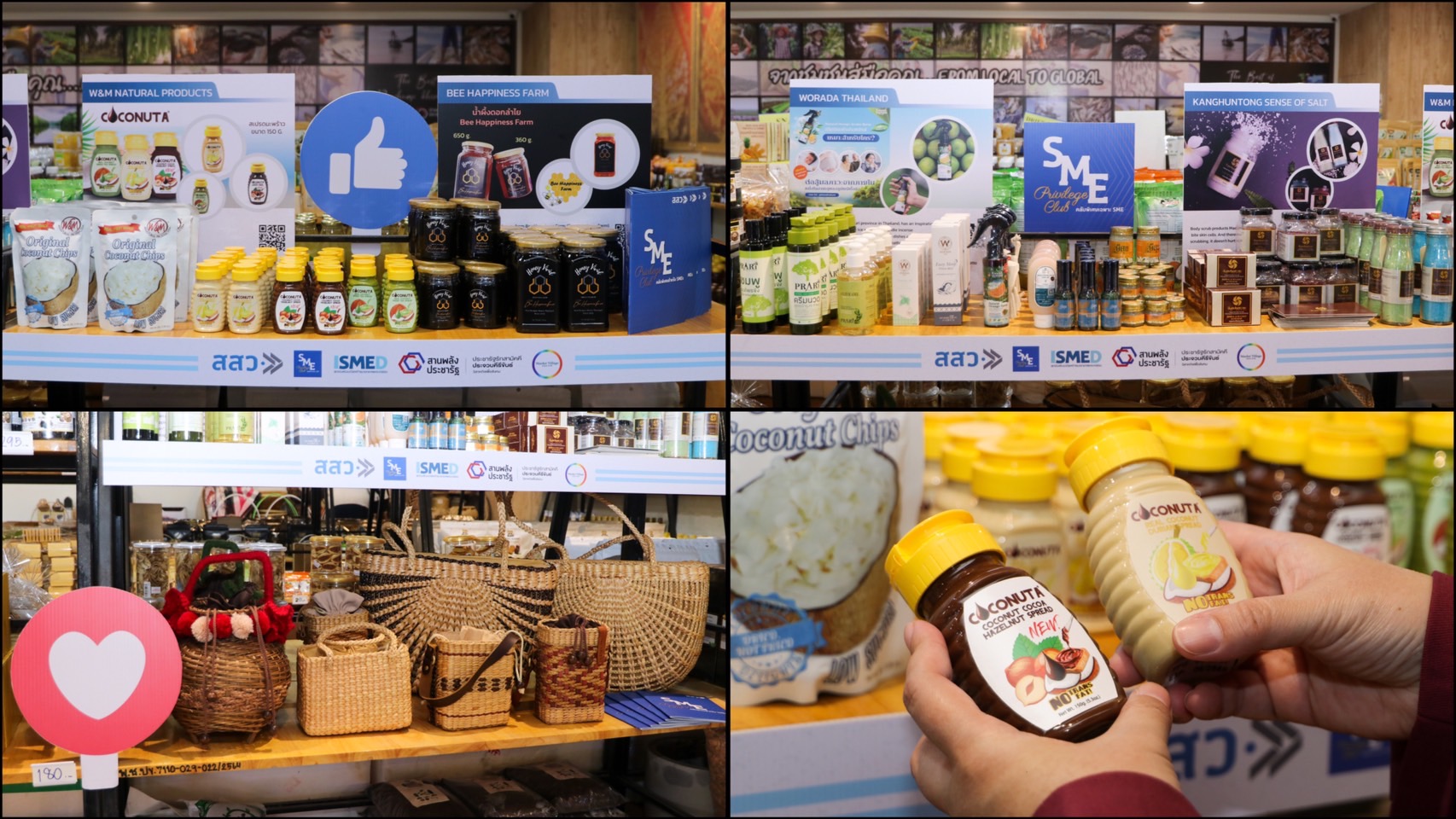 ในงานเปิดตัวความร่วมมือครั้งนี้ ได้มีการจัดแสดงผลิตภัณฑ์จากผู้ประกอบการที่เป็นสมาชิก สสว. ที่ได้รับคัดเลือกให้นำสินค้ามาทดสอบตลาด ณ ร้านค้าประชารัฐ ประจวบคีรีขันธ์ ศูนย์การค้ามาร์เก็ตวิลเลจหัวหิน โดยมีสินค้าที่น่าสนใจ อาทิเช่นยาหม่องสมุนไพร ษีสุข ใช้สูดดมและนวด, ดอกเกลือบริสุทธิ์สำหรับขัดผิว กังหันทอง, ลิโมนีน อโรมาสเปรย์ กู้ดเนเจอร์ ช่วยต้านการอักเสบและเพิ่มภูมิ (ภูมิแพ้), ผลิตภัณฑ์ดูแลร่างกาย (body care) จาก Prari, น้ำผึ้งดอกลำไย จาก Bee Happiness Farm, และผลิตภัณฑ์เพื่อสุขภาพจากมะพร้าว coconuta เป็นต้น