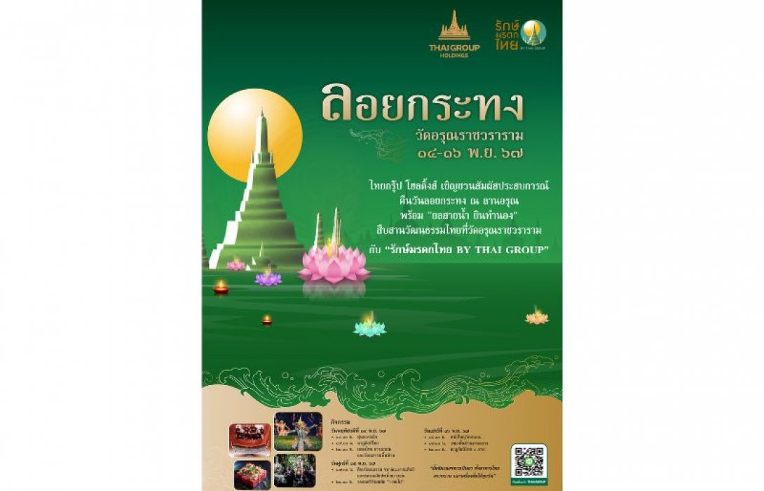 บริษัท ไทยกรุ๊ป โฮลดิ้งส์ จำกัด (มหาชน) กลุ่มธุรกิจประกันและการเงินในเครือทีซีซี ร่วมกับ Bangkok River Festival 2024 สายน้ำแห่งวัฒนธรรมไทย สืบสานคุณค่าวัฒนธรรมประเพณีในงานลอยกระทง ที่วัดอรุณราชวราราม ราชวรมหาวิหาร กรุงเทพมหานคร ระหว่างวันที่ 14-16 พฤศจิกายนนี้ ตอกย้ำแนวคิด “รักษ์มรดกไทย BY THAI GROUP” ขอเชิญทุกท่านร่วมสัมผัสกับความงดงามทางวัฒนธรรม เพลิดเพลินไปกับประเพณีลอยกระทงแบบไทย และพบกับกิจกรรมอีกมากมาย ทั้งไหว้พระ ทำบุญ ช้อปสินค้าภูมิปัญญาไทยและลิ้มลองอาหารคาวหวานจากชุมชน ซึ่งในปีนี้ทางไทยกรุ๊ปฯ ได้จัดเตรียมบ่อลอยรักษ์โลก ซุ้ม “อาหารไทยเป็นยา” และการแสดงศิลปวัฒนธรรม นำโดยการบรรเลงดนตรีไทยจากวงกอไผ่ วงดนตรีไทยร่วมสมัยที่มีอายุยาวนานกว่า 3 ทศวรรษ และชนะเลิศการแข่งขันดนตรีไทยเพื่อความมั่นคงแห่งชาติ เมื่อปี 2526 จัดโดยมูลนิธิหลวงประดิษฐไพเราะ (ศร ศิลปบรรเลง) และสหพันธ์ประสานงานเพื่อความมั่นคงแห่งชาติ สร้างสรรค์คุณค่าความเป็นไทย ณ ลานอรุณ (บริเวณลานด้านหน้าของปฏิมากรรมรูปยักษ์) พร้อมเชิญชวนแต่งกายด้วยชุดผ้าไทยและใช้กระทงที่เป็นมิตรกับสิ่งแวดล้อม เพื่อร่วมอนุรักษ์ธรรมชาติอย่างยั่งยืน