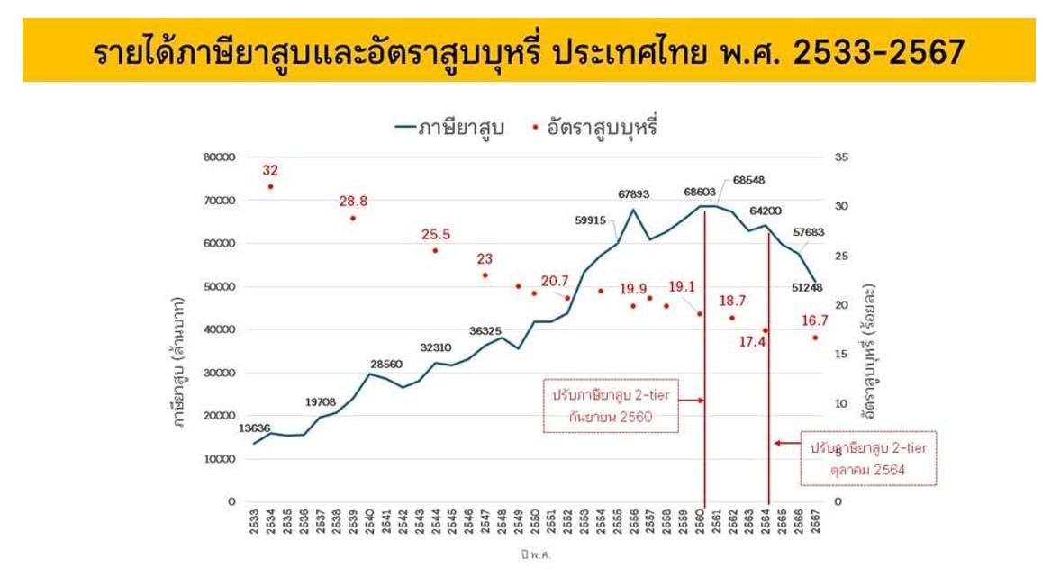 นพ.ประกิต เล่าว่า ประเทศไทยเคยใช้ภาษีบุหรี่ 3 อัตราเพื่อป้องกันการนำเข้าบุหรี่จากต่างประเทศ แต่ถูกยกเลิกเมื่อ 35 ปีที่แล้วเนื่องจากการฟ้องร้องในที่ประชุมว่าด้วยพิกัดอัตราภาษีศุลกากรและการค้า(แกตต์) หรือองค์การการค้าโลก( WTO) ในปัจจุบัน รัฐบาลไทยจึงต้องเปิดตลาดและใช้อัตราภาษีสรรพสามิตที่ 55% สำหรับบุหรี่ทั้งในประเทศและนำเข้าตั้งแต่กลางปี พ.ศ.2533 จนสามารถสร้างรายได้มหาศาล อย่างไรก็ตาม ทุกอย่างเปลี่ยนไปเมื่อเปลี่ยนมาใช้ภาษีแบบ 2 อัตราในปี 2560
