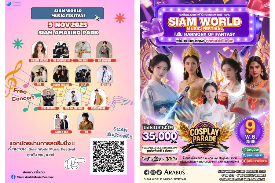 ณัฐรัชต์ จิระพลพนิต หัวหน้าโครงการ Siam World Music Festival เปิดเผยว่า งาน “Siam World Music Festival 2025” เทศกาลดนตรีและวัฒนธรรมสุดยิ่งใหญ่ เป็นฟรีคอนเสิร์ต ที่ได้รับการสนับสนุนจาก สำนักงานกองทุนพัฒนาสื่อปลอดภัยและสร้างสรรค์ เพื่อสร้างเวทีที่ผสมผสานพลังของดนตรี ศิลปะ และการท่องเที่ยวเข้าไว้ด้วยกันอย่างกลมกลืน นับได้ว่าเป็นการรวมตัวของศิลปินแนวหน้าของประเทศ ที่จะทำให้งานเทศกาลครั้งนี้เปี่ยมไปด้วยสีสันดนตรีที่หลากหลาย ตั้งแต่ไทย ป๊อปร็อก อินดี้ ไปจนถึงอิเล็กทรอนิกส์ และโชว์ที่ผสมผสานความร่วมสมัย