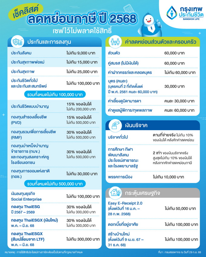• โครงการ Easy E-Receipt 2.0 (ตั้งแต่วันที่ 16 มกราคม - 28 กุมภาพันธ์ 2568) ลดหย่อนภาษีได้สูงสุด 50,000 บาท จากการซื้อสินค้าหรือค่าบริการ ที่มี e-Tax Invoice หรือ e-Receipt