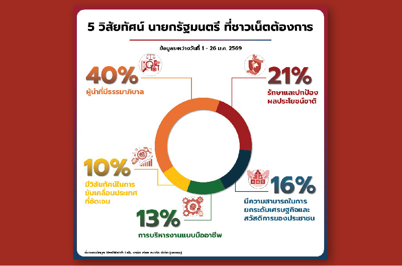 เรียลวอทช์ แล๊ป (RealWatch Lab) ส่วนวิจัยและวิเคราะห์ข้อมูล (Research and Data Analytics) บริษัท เรียล สมาร์ท จำกัด(มหาชน) บริษัท ด้าน AI-Data Driven Technology เปิดเผยถึง ผลสำรวจความเห็นของชาวเน็ต ระหว่างวันที่ 1-26 มกราคม 2569 ในทุกแพลตฟอร์ม ถึง นายกรัฐมนตรี ที่ชาวเน็ต ต้องการ จากการเลือกตั้งในวันที่ 8 กุมภาพันธ์ 2569 จำนวน 160,063 ข้อความ พบว่า 40% ของชาวเน็ต ต้องการ “นายกรัฐมนตรี ที่มีธรรมาภิบาล บริหารงานอย่างโปร่งใส ไม่ทุจริต ไม่โกงกิน”