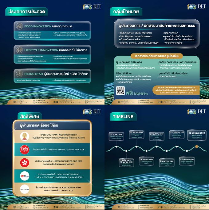 กรมการค้าต่างประเทศ โดยสถาบันส่งเสริมสินค้าเกษตรนวัตกรรม (สกน.) ได้ดำเนินโครงการสร้างสรรค์มูลค่าเพิ่มสินค้าเกษตรนวัตกรรมสู่ตลาดสากล จัดการประกวด “Agri Plus Award 2026 โดยในครั้งนี้ จัดขึ้นเป็นครั้งที่ 5 โดยได้รับพระมหากรุณาธิคุณจากสมเด็จพระกนิษฐาธิราชเจ้า กรมสมเด็จพระเทพรัตนราชสุดาฯ สยามบรมราชกุมารี พระราชทานถ้วยรางวัลแก่ผู้ชนะการประกวด 3 ประเภท ได้แก่ (1) Food Innovation (กลุ่มผลิตภัณฑ์อาหาร) (2) Lifestyle Innovation (กลุ่มผลิตภัณฑ์ที่ไม่ใช่อาหาร) และ (3) Rising Star (กลุ่มผลิตภัณฑ์จากผู้ประกอบการรุ่นใหม่) โดยในปีนี้จัดขึ้นภายใต้แนวคิด “Thailand’s Agri Inno Wave” สินค้าเกษตรนวัตกรรมไทย คลื่นลูกใหม่บุกตลาดโลก ซึ่งเป็นคลื่นแห่งนวัตกรรมในภาคการเกษตรของไทยที่ยกระดับสินค้าเกษตรนวัตกรรมไทยมุ่งสู่ตลาดสากล ด้วยการบูรณาการห่วงโซ่คุณค่าแบบครบวงจร เพื่อตอบโจทย์ความต้องการของตลาดโลก ซึ่งแนวคิดของการจัดประกวดปีนี้ สืบเนื่องมาจากการที่ประเทศไทยมีรากฐานด้านการเกษตรที่เข้มแข็งมาอย่างยาวนาน ภาคเกษตรกรรมไม่ได้เป็นเพียงภาคการผลิตที่สำคัญของประเทศเท่านั้น แต่ยังเป็นรากฐานของความมั่นคงทางอาหาร เศรษฐกิจฐานราก และวิถีชีวิตของประชาชนจำนวนมาก ซึ่งปัจจุบันประเทศไทยไม่ได้เป็นเพียง “ครัวของโลก” อีกต่อไป แต่กำลังก้าวสู่บทบาทใหม่ในฐานะ“ผู้สร้างสรรค์สินค้าเกษตรนวัตกรรมของโลก” โดยคลื่นลูกใหม่ของสินค้าเกษตรนวัตกรรมไทยที่กำลังเติบโตอย่างรวดเร็วและมีศักยภาพสูง ผนวกกับพลังของนวัตกรรม จะเป็นแรงขับเคลื่อนสำคัญที่ผลักดันสินค้าเกษตรไทยให้ก้าวไกลสู่เวทีโลกได้