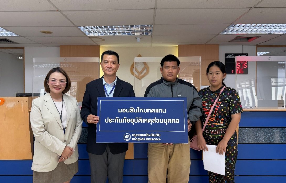 บริษัท กรุงเทพประกันภัย จำกัด (มหาชน) มอบสินไหมทดแทนประกันภัยอุบัติเหตุส่วนบุคคล PA VIP จำนวน 3,120,000 บาท ให้แก่นางสาวมุกดา พิมพิลา (ขวาสุด) และนายสุวัฒน์ พิมพิลา (ที่ 2 จากขวา) ผู้รับประโยชน์ ซึ่งเป็นบุตรของนายสังเวียน พิมพิลา ผู้เอาประกันภัยที่ประสบอุบัติเหตุเสียชีวิต ณ ธนาคารกรุงเทพ สาขาอุตรดิตถ์ จังหวัดอุตรดิตถ์ เมื่อเร็วๆ นี้
